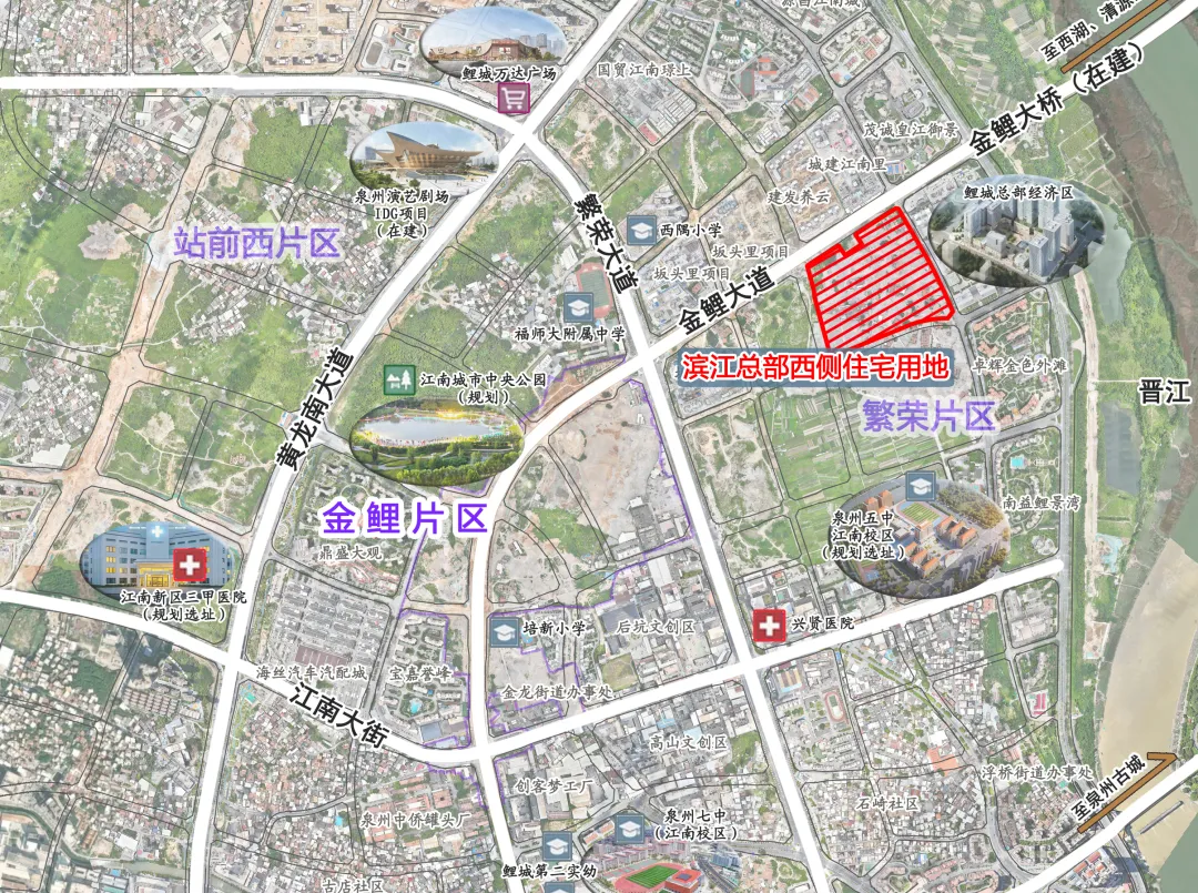 滨江总部西侧住宅用地占地163.74亩,容积率2.6,紧邻泉州五中江南校区、兴贤医院、鲤城万达广场,生活配套成熟;
