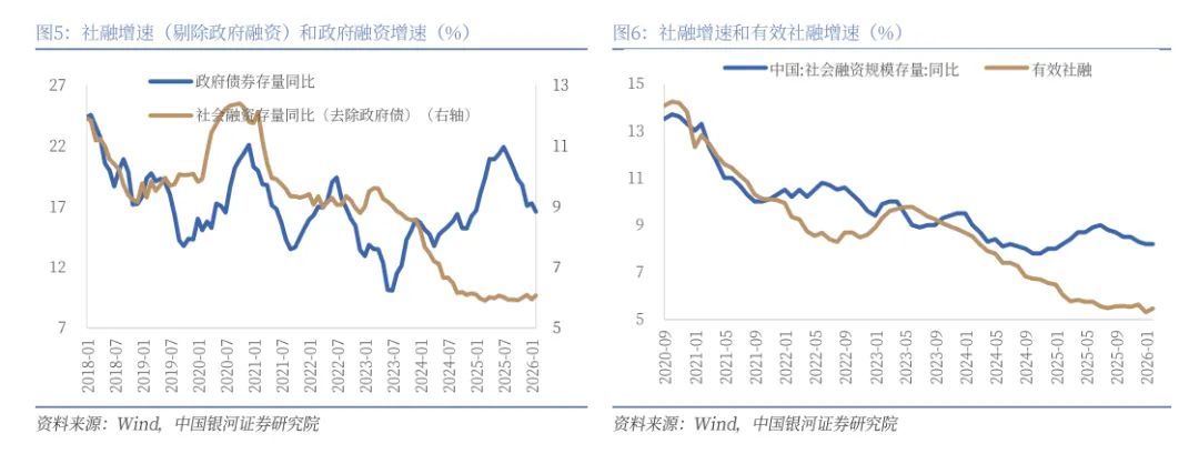 本月社融各分项,只有政府债券融资和企业债券融资同比少增,其余各项均呈现同比多增。2月新增社融2.4万亿元,同比多增1461亿元,同比多增的项目包括对实体的人民币贷款和外币贷款、表外融资和股票融资,分别同比多增1956亿元、246亿元、1918亿元和378亿元。人民币升值预期叠加中国企业的出海需求,这会增加外币贷款需求,外币贷款呈现连续同比多增。同比少增的项目则主要包括政府债券融资和企业债券融资,分别同比少增2903亿元和181亿元。企业债券融资同比少增主要来自由于科技创新债券发行有所放缓,2月科技创新债券净融资额约809亿元。政府债券融资增速下行,增速为16.57%(前值17.27%),剔除政府融资的社融增速为6.08%(前值5.94%),环比上月上行。有效社融增速(中长期贷款+委托+信托+直接融资)为5.47% (前值5.31%),环比上行。