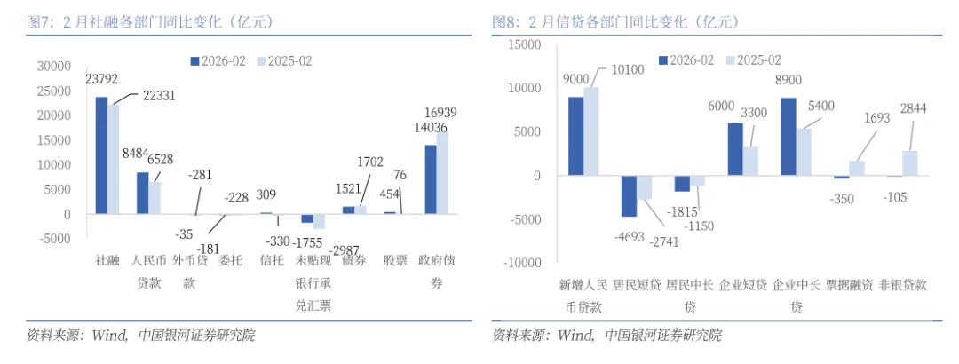 M2增速持平,保持在较高水平。本月贷款增速保持回落,带来信贷派生的货币减少,在此背景下M2增速持平可能受到以下两个派生渠道的支撑:一是银行外汇占款同比多增,增加了货币派生,我们观察到2025年12月和2026年1月银行外汇占款均呈现同比多增,这一趋势可能在2月延续;二是财政支出节奏可能较快,其派生的货币增加。2月金融机构人民币存款新增1.17万亿元,其中居民存款新增3.1万亿元、企业存款减少2.7万亿元、非银存款增加1.4万亿元。2月金融机构新增人民币存款同比少增3.3万亿元,其中居民同比多增2.5万亿元,企业同比多减1.8万亿元,非银存款同比少增1.4万亿元。