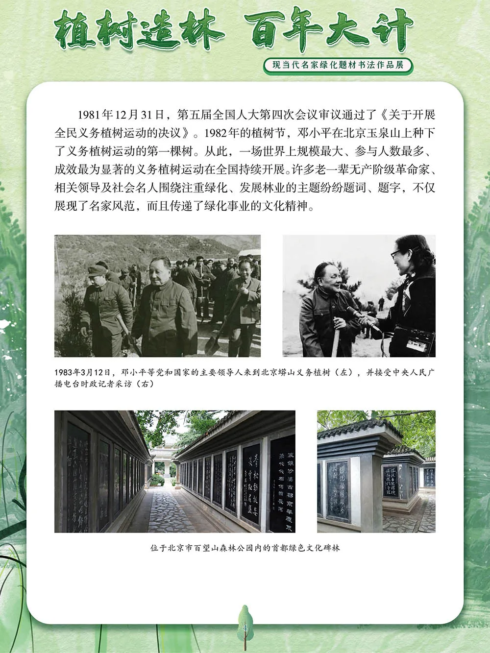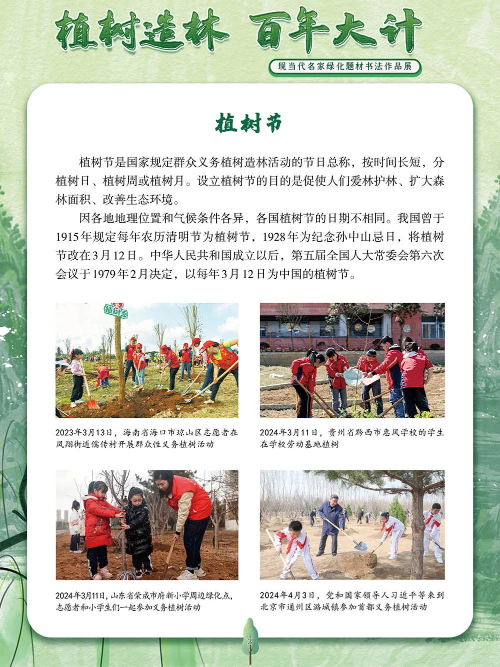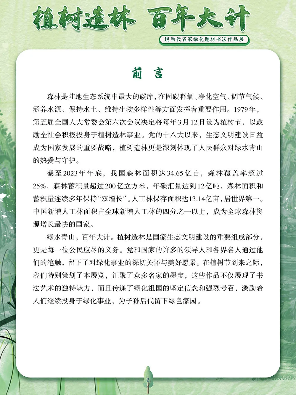 森林是陆地生态系统中最大的碳库,在固碳释氧、净化空气、调节气候、涵养水源、保持水土、维持生物多样性等方面发挥着重要作用。1979年,第五届全国人大常委会第六次会议决定将每年3月12日设为植树节,以鼓励全社会积极投身于植树造林事业。党的十八大以来,生态文明建设日益成为国家发展的重要战略,植树造林更是深刻体现了人民群众对绿水青山的热爱与守护。绿水青山,百年大计。植树造林是国家生态文明建设的重要组成部分,更是每一位公民应尽的义务。党和国家的许多的领导人和各界名人通过他们的笔触,留下了对绿化事业的深切关怀与美好愿景。在植树节到来之际,我们特别策划了本展览,汇聚了众多名家的墨宝,这些作品不仅展现了书法艺术的独特魅力,而且传递了绿化祖国的坚定信念和强烈号召,激励着人们继续投身于绿化事业,为子孙后代留下绿色家园。