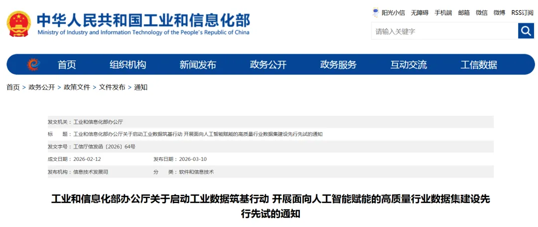 3月10日,工业和信息化部发布了《工业和信息化部办公厅关于启动工业数据筑基行动 开展面向人工智能赋能的高质量行业数据集建设先行先试的通知》(以下简称:通知)。