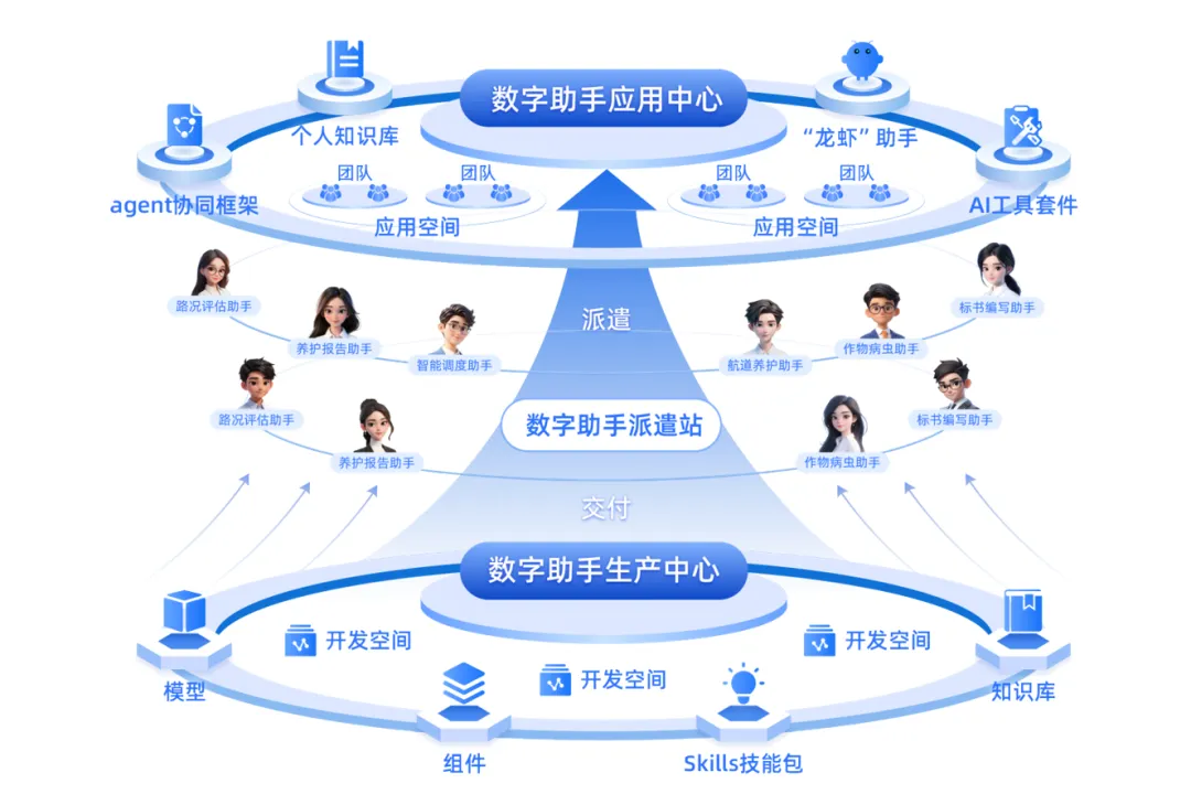 在智慧机场建设中,机场交通、航班规划与场站安防助手推动旅客满意度与运行效率双提升;在高速公路上,交通流量辅助控制智能体对运行状态实时估计与拥堵精准研判;在数字乡村建设中,茶叶种植助手、农机管理助手成为数字化转型的“新农具”。在某大型制造企业,平台同时管理着合同审核、投标处理、质量追溯等十余个智能体,实现统一调度与安全管控。