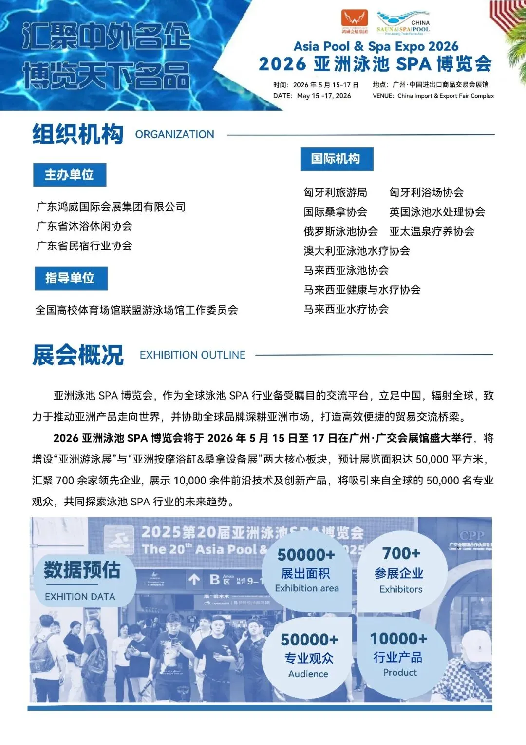 2026 年 5 月 15-17 日,2026 亚洲泳池 SPA 博览会将在广州・中国进出口商品交易会展馆盛大启幕!本次展会由广东鸿威国际会展集团有限公司、广东省沐浴休闲协会、广东省民宿行业协会联合主办,全国高校体育场馆联盟游泳场馆工作委员会担任指导单位,匈牙利旅游局、国际桑拿协会等众多国际机构鼎力支持。作为全球泳池 SPA 行业极具影响力的专业交流平台,本届展会立足中国、辐射全球,特设 “亚洲游泳展”“亚洲按摩浴缸 & 桑拿设备展” 等核心板块,展览面积预计达 50000 平方米,汇聚 700 余家行业领先企业,展示超 10000 件前沿技术与创新产品,吸引全球 50000 名专业观众齐聚。展品覆盖泳池设备、SPA 水疗、水上乐园、水景喷泉、热水及水处理等全产业链,同期还将举办行业高峰论坛、匠池奖颁奖典礼、国际泳尚节等系列高端活动,融合 “展 + 宴 + 奖 + 会 + 秀” 多元形式,打造集论坛研讨、品牌推广、供需对接、国际合作、贸易洽谈于一体的专业化展贸平台,助力亚洲产品走向世界,推动全球品牌深耕亚洲市场。汇聚中外名企,博览天下名品,2026 亚洲泳池 SPA 博览会诚邀泳池 SPA 全产业链同仁莅临参会,共探行业趋势,共襄产业盛举,见证行业发展新篇章!