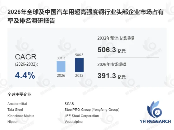 据恒州诚思最新调研数据显示,2025年全球汽车用超高强度钢(UHSS)市场规模预计达375.6亿元,受全球汽车轻量化进程加速(2025年全球新能源汽车平均减重目标达15%)、安全法规趋严(2025年欧盟新车安全评鉴协会NCAP将侧碰标准提升至80km/h)等因素影响,行业将维持4.4%的年复合增长率(CAGR),至2032年市场规模有望接近506.3亿元。作为汽车结构安全的核心材料,UHSS正从单一强度提升向"强度-韧性-成形性"协同优化方向演进,2025年全球第三代UHSS(抗拉强度≥1200MPa)渗透率预计达42%,较2021年提升28个百分点。