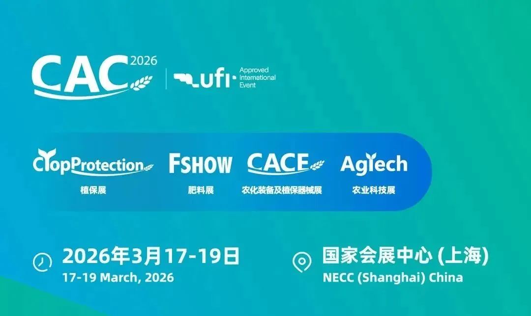 第二十六届中国国际农用化学品及植保展览会(CAC2026)将于2026年3月17-19日在国家会展中心(上海)举办。同期将召开中国国际植保展览会(CropProtection)、中国国际新型肥料展览会(FSHOW)、中国国际农化装备及植保器械展览会(CACE)、中国国际现代农业科技展览会(AgTech)及农化会议周(CACW)等分题展览及行业专题会议。
