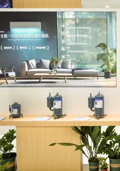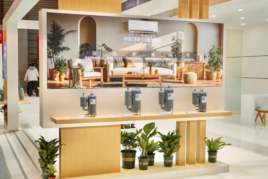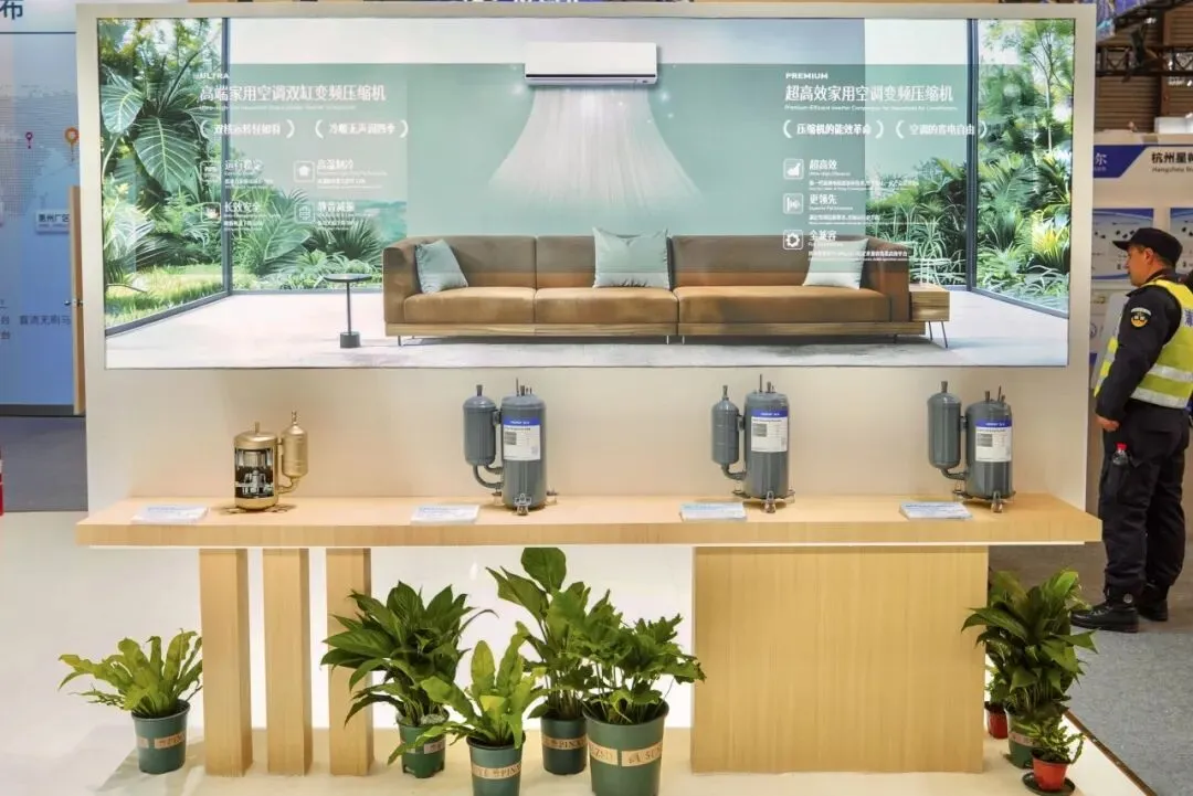 在家用领域,海立展出一系列精准匹配多元化需求的创新产品。针对极端高温环境设计的中东(热带)空调压缩机,制冷能力显著提升;高端家用空调双缸变频压缩机以“双核运转矩如羽,冷暖无声润四季”为核心卖点,集成静音减振技术,高温环境下制冷效率提升15%;超高效家用空调变频压缩机与小型化家用空调压缩机分别聚焦能效升级与空间优化,满足不同户型、不同使用场景的家居需求;R290家用空调压缩机则采用环保冷媒,为绿色家电普及提供核心支撑。