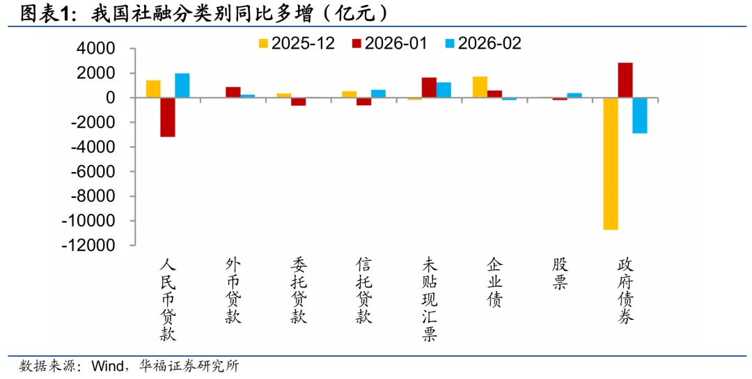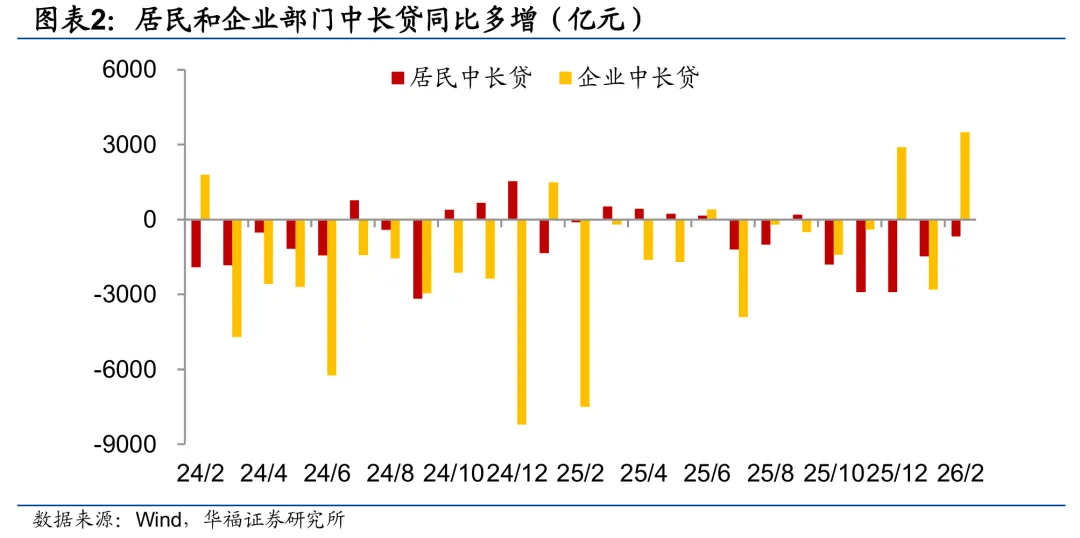 企业中长贷贡献信贷主要增量。2月社融同比多增额缩小,高基数下政府债券同比转为少增,而信贷和未贴现承兑汇票对社融同比多增构成支撑,年初银行开票需求较旺,且信贷的拖累有所减弱。具体来看,2月贷款投放季节性回落,但同比少增额有所收窄,主要是企业部门的贡献,一方面,财政、准财政持续发力,开工节奏提速,提振配套的融资需求,主要反映在企业中长贷改善上;另一方面,春节前企业工资、奖金发放推动经营性资金需求走升,企业短贷保持较高规模,跷跷板效应下票据融资保持疲弱。外汇流入继续对M2构成支撑。去年同期基数明显走低,2月M1增速较上月继续反弹1个百分点,新口径下春节效应对于M1的影响很小。2月M2增速保持在9%的高位,一方面,2月政府债净融资达1.4万亿元,财政靠前发力带动企业现金流改善;另一方面,人民币持续走强,跨境回流以及结汇需求的释放对于境内流动性继续构成补充。短期来看,随着节后复工复产,春节假期的影响消散,3月信贷读数对于需求修复程度或更具指示意义;中长期来看,信贷重质轻量、财政同比扩张力度减弱,叠加基数偏高的影响下,社融和信贷增速仍有下行压力。政府债同比转少增,信贷对社融的拖累减弱。2026年2月,社会融资规模增量为2.38万亿元,同比多增额略降至1461亿元,人民币贷款和未贴现承兑汇票是社融同比多增的主要支撑,一方面,2月社融口径下的人民币贷款增加8484亿元,同比由少增转为多增1956亿元;另一方面,未贴现承兑汇票同比多增额收缩至1232亿元。直接融资方面,2月政府债券净融资规模抬升至1.4万亿元,但同比由多增转为少增2903亿元;2月企业债券净融资规模下降至1521亿元,同比由多增转为少增181亿元;境内股票融资同比由少增转为多增378亿元。非标融资方面,2月信托贷款同比由少增转为多增639亿元,委托贷款同比由少增转为多增47亿元。居民贷款仍弱,企业中长贷贡献主要增量。2月新增人民币贷款9000亿元,同比少增额缩小至1100亿元。具体来看,2月居民部门贷款减少6507亿元,同比由多增转为少增2616亿元,其中短期贷款和中长期贷款分别减少4693亿元和1815亿元,同比变化来看,2月居民短贷同比由多增转为少增1952亿元,中长贷同比少增额收窄至665亿元。2月企业部门贷款增加1.49万亿元,其中企业短贷增加6000亿元,同比多增额缩小至2700亿元;企业中长贷增加8900亿元,同比由少增转为多增3500亿元;票据融资规模减少350亿元,同比少增额缩小至2043亿元。