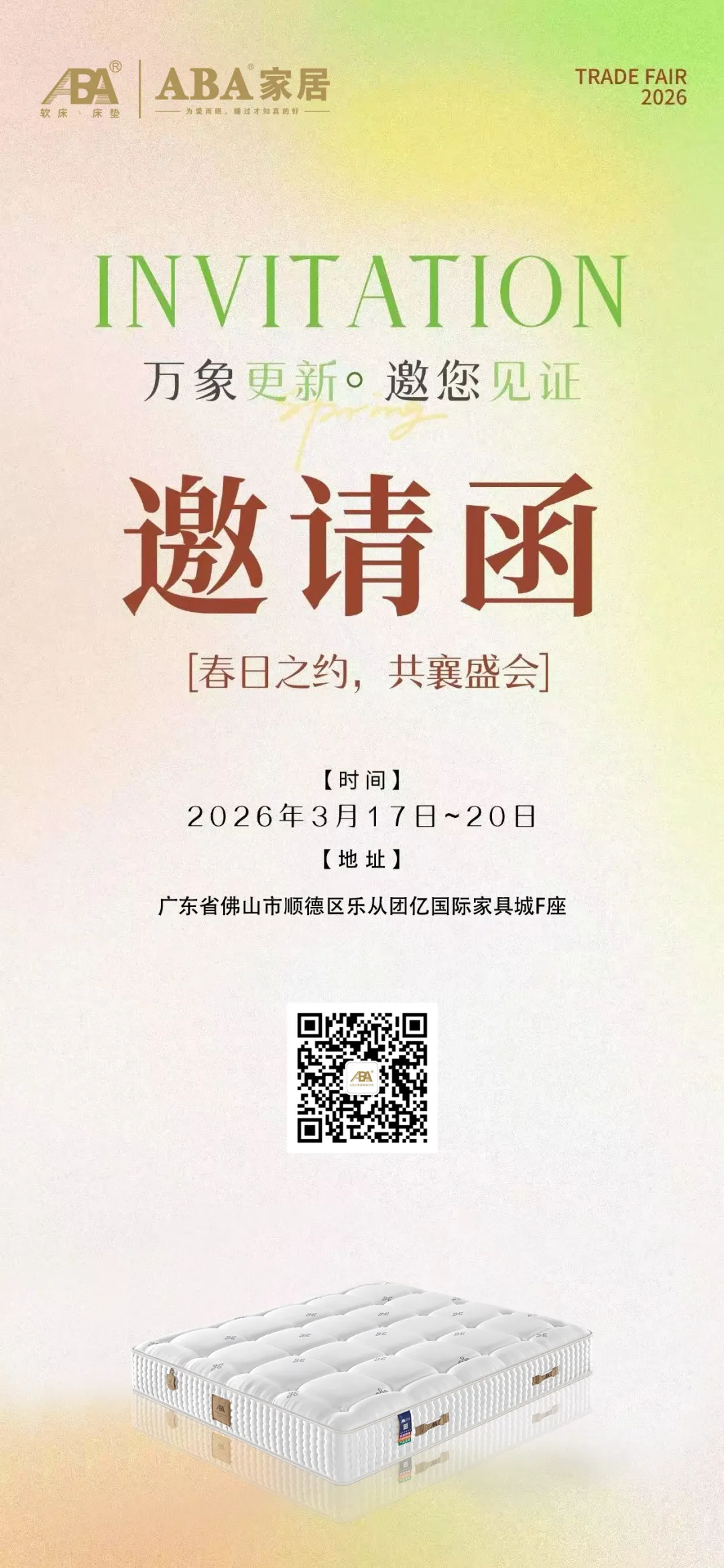 ABA家居3月家具新品展暨经销合作盛会,也将于3月17日-20日隆重开展,诚邀全国经销商齐聚,共同见证新一季全系列产品的创新与突破,共商合作新模式,携手引领高端睡眠新赛道!