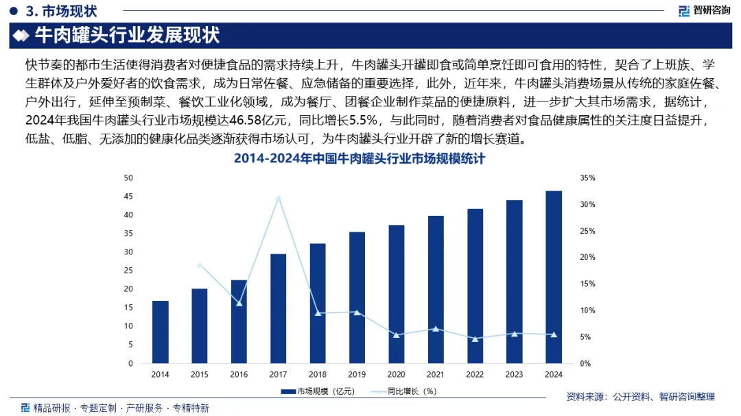 牛肉罐头是以鲜(冻)牛肉为主要原料,经预处理、腌制、预煮、装罐、排气、密封、杀菌等工艺制成的可常温保存的罐装食品。快节奏的都市生活使得消费者对便捷食品的需求持续上升,牛肉罐头开罐即食或简单烹饪即可食用的特性,契合了上班族、学生群体及户外爱好者的饮食需求,成为日常佐餐、应急储备的重要选择,此外,近年来,牛肉罐头消费场景从传统的家庭佐餐、户外出行,延伸至预制菜、餐饮工业化领域,成为餐厅、团餐企业制作菜品的便捷原料,进一步扩大其市场需求,据统计,2024年我国牛肉罐头行业市场规模达46.58亿元,同比增长5.5%。