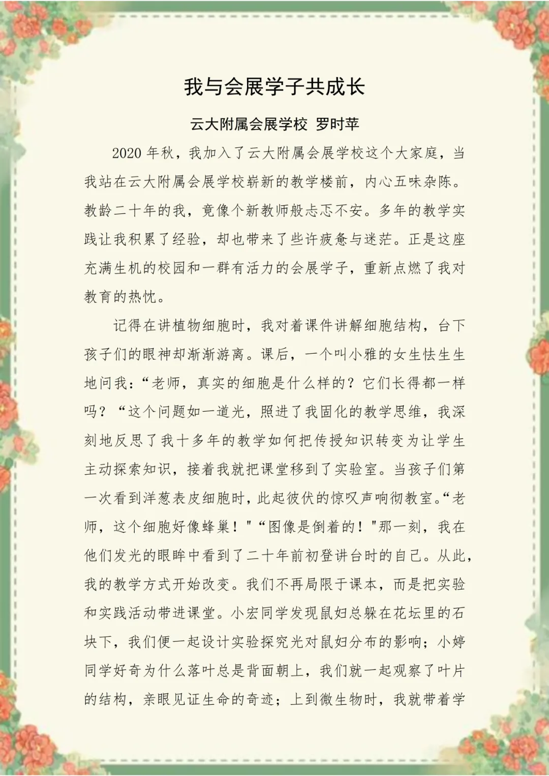 2020年秋,当罗时苹老师第一次走进云大附属会展学校的校门,二十年的教龄沉淀了经验,却也让她不自觉地陷入某种惯性。直到课堂上那个怯生生的提问——“老师,真实的细胞是什么样的?”——轻轻落下,她才猛然意识到,自己已在“教”的路上走了太久,却忘了学生眼里的“学”本该是什么样子。于是,她把课堂搬进实验室,让孩子们在显微镜下发现世界的奇妙;她带领学生观察鼠妇、探究落叶、制作甜白酒,在一次次实践中点燃求知的火花。“教学相长”四个字,在她与学生共同探索生命奥秘的过程中,有了最真切的注解。