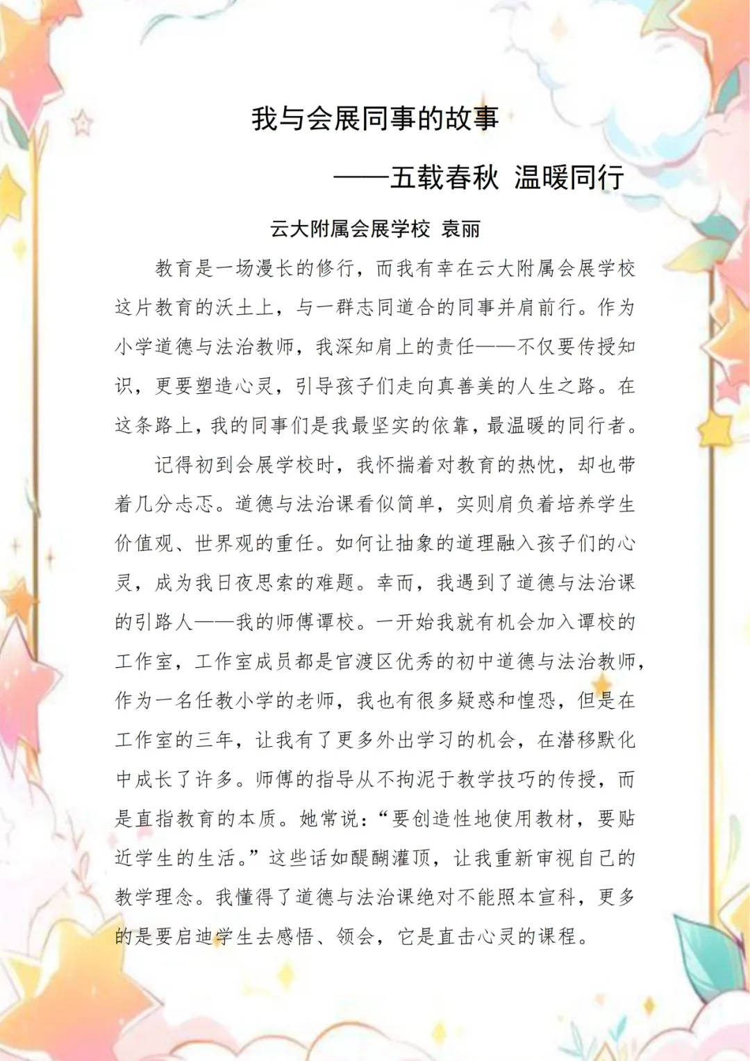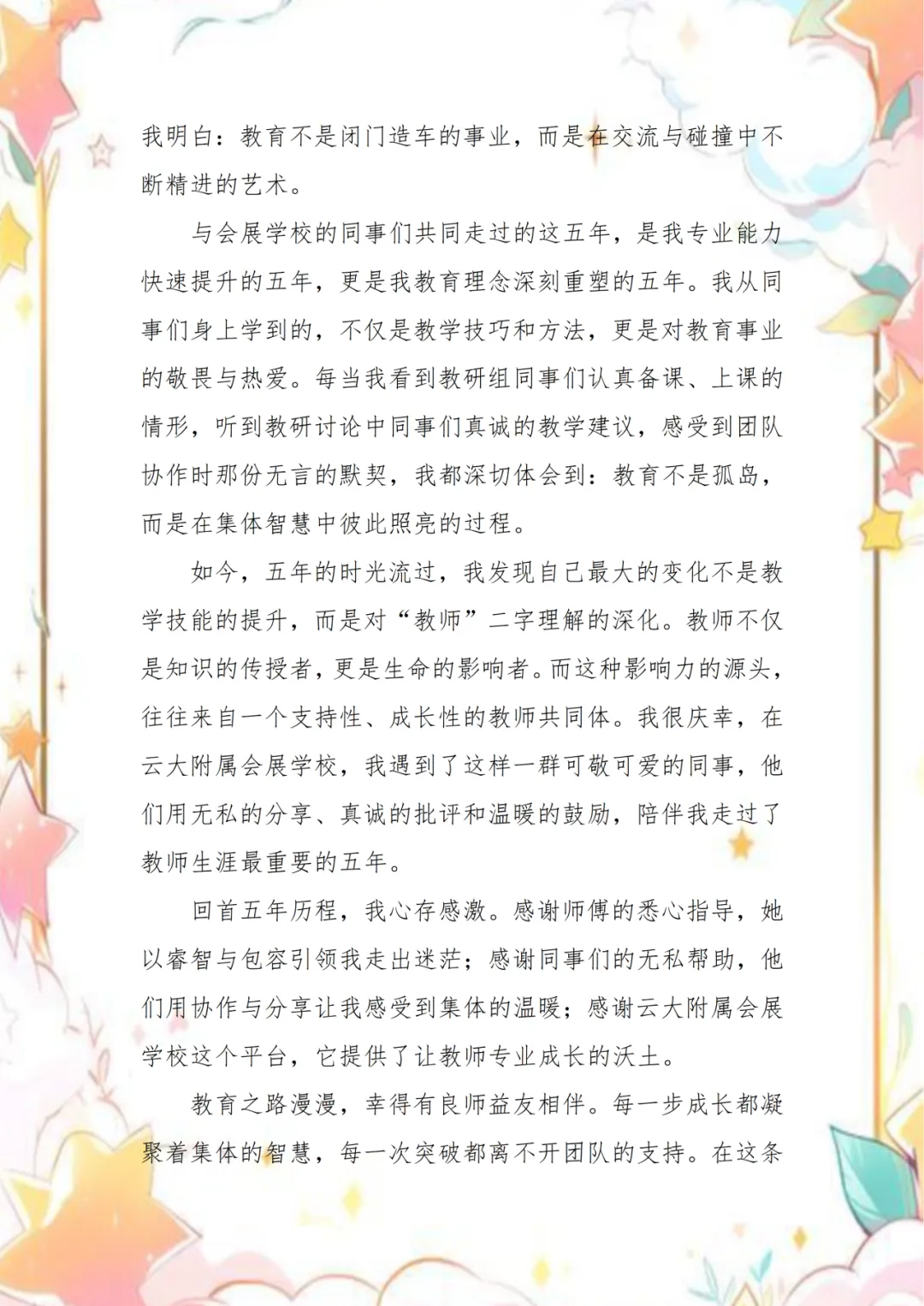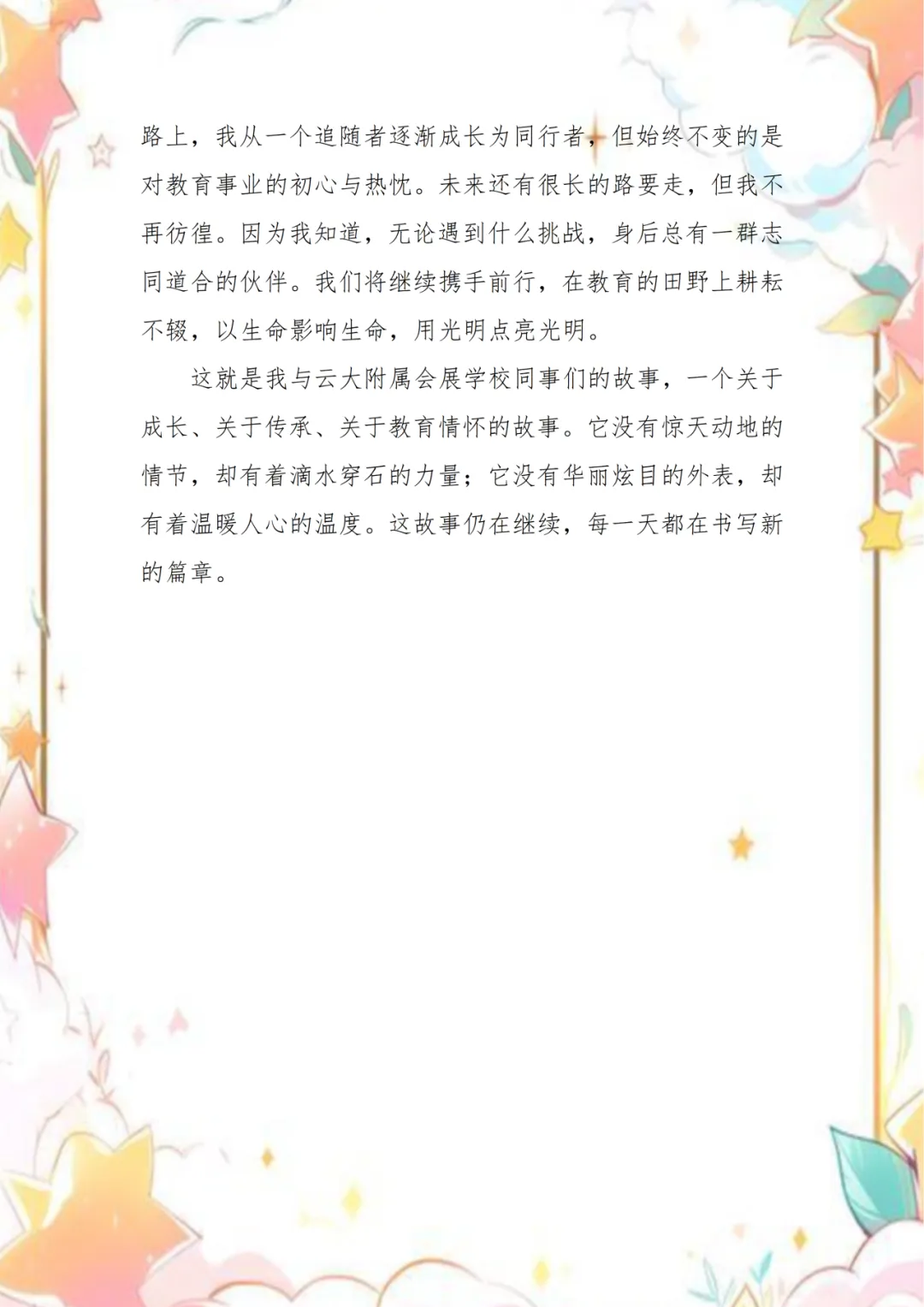九度春秋,不过时间长河中的一瞬,却足以让一颗种子长成树,让一份初心沉淀为信仰。在云大附属会展学校,教育的意义从来不是单向的教授,而是无数个“我”与“你”之间的彼此照亮。每一位老师的身影,都是一束微光;而微光汇聚之处,便是教育最温暖的模样。