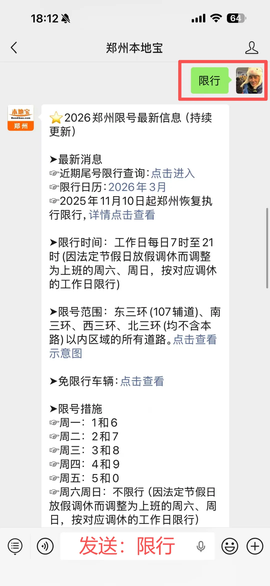 在聊天对话框回复【限行】即可获取