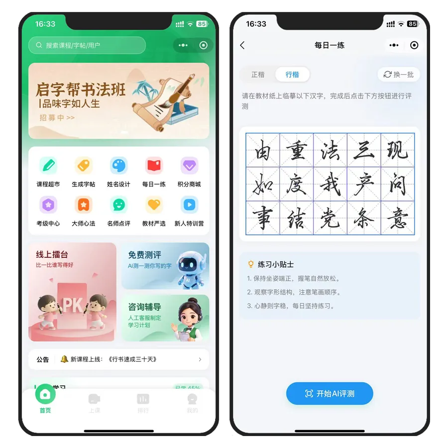 启字帮 AI 练字小程序,所有教学课程均由华栋练字创始人李华栋先生亲自录制,独家行楷字体也由先生亲笔书写。孩子进入小程序就能直接跟随行楷 “连贯操”、汉字结构脑成像技术发明人学习,足不出户获得名师真传,用更少时间,练出又快又好的实用行楷。