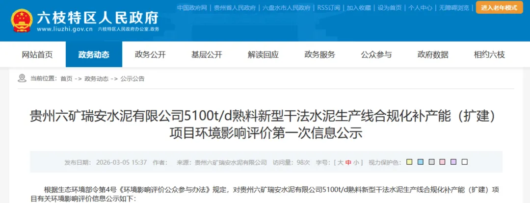 水泥巨头海螺水泥近日在贵州市场悄然落下一子。3月初,贵州六盘水市六枝特区人民政府网站发布的一则环评公示,揭开了这场产能指标交易的细节:海螺水泥控股子公司贵州六矿瑞安水泥有限公司,计划将一条4500t/d的熟料生产线“扩容”至5100t/d 。