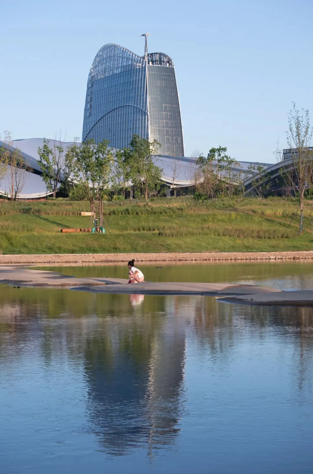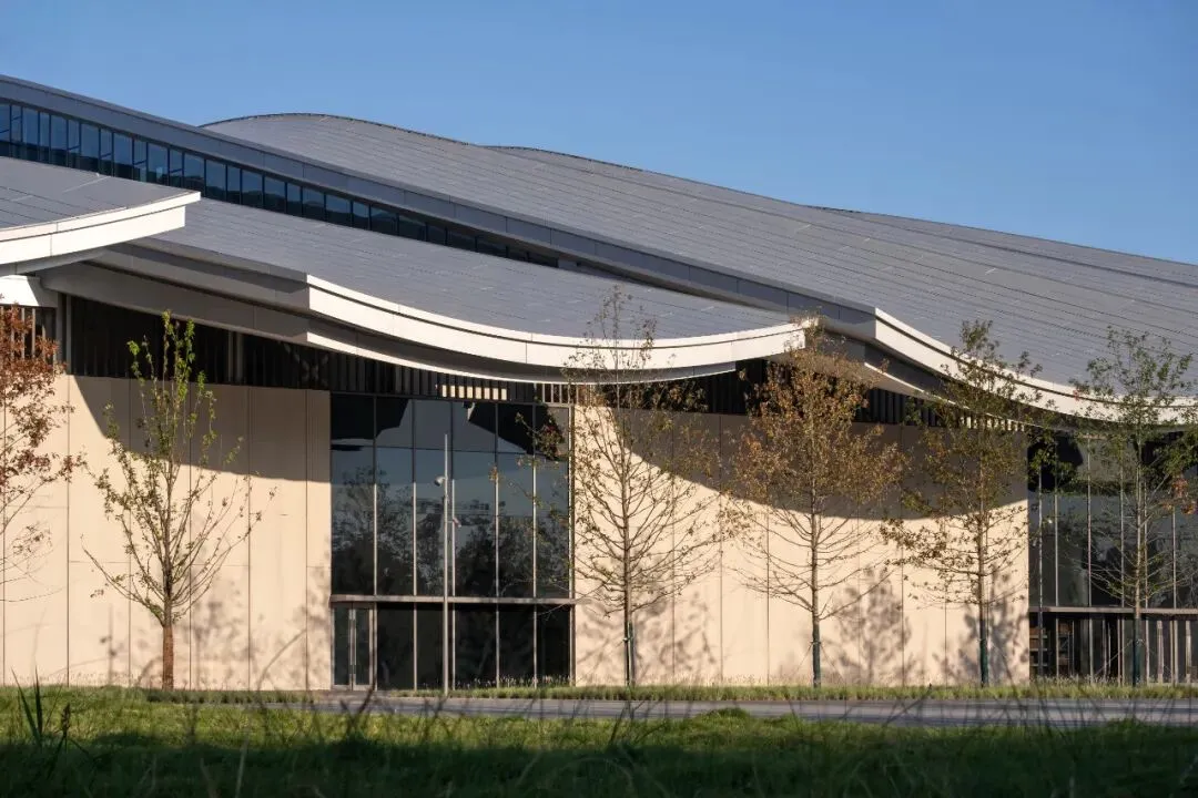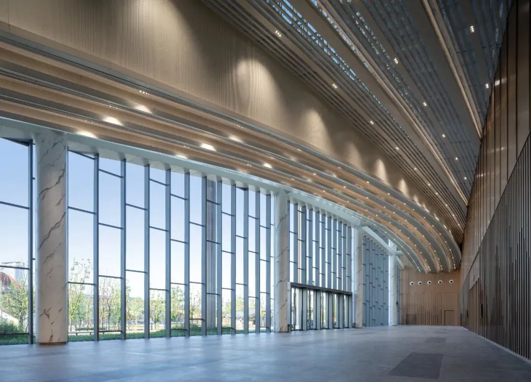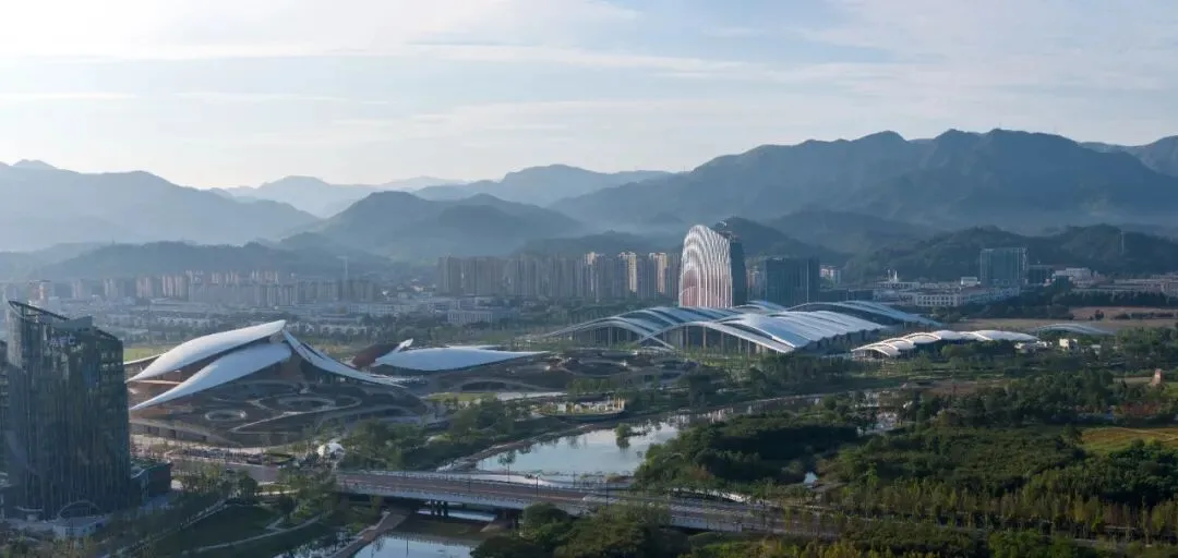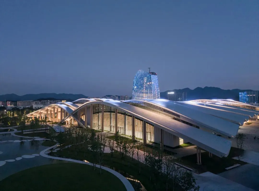 整个建筑群如群山一般,时而匍匐在地面,时而拔地而起,时而舒展伸向远方,运用如自然山水的线条,有机延伸,在青山绿水边创造了一个融入环境与城市气质的地标。