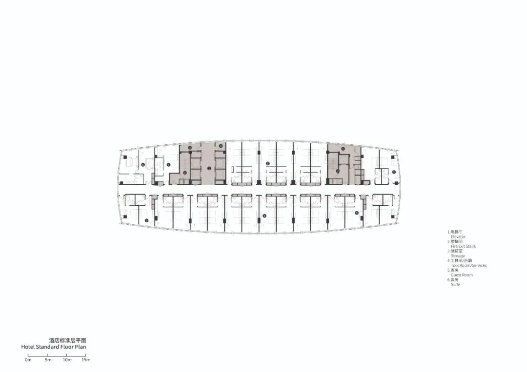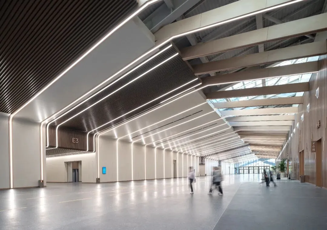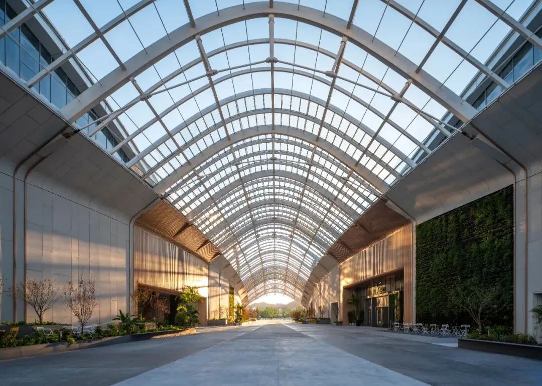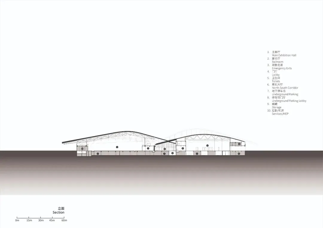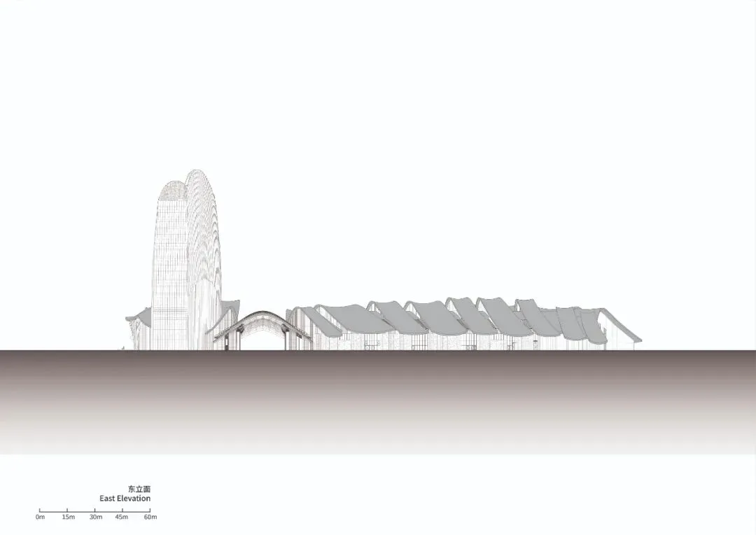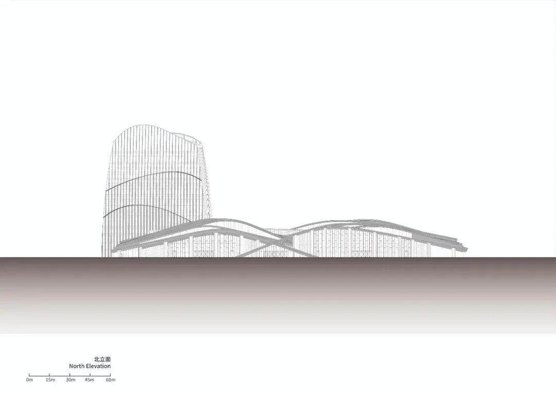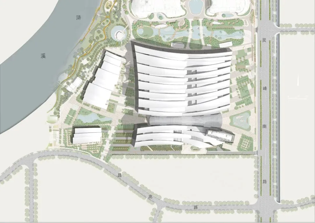 东西向通廊为最重要轴线空间,联系东侧的城市干道灵峰南路,至西侧浒溪河畔的自然滨水景观带。通廊的北侧布局会展、南侧布局酒店功能。这条通廊用轻盈有力的结构形式,保证这条城市景观轴线望山见水的通透视觉效果。