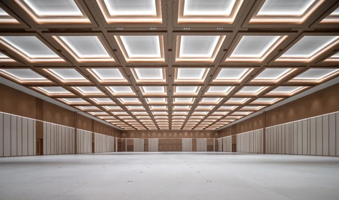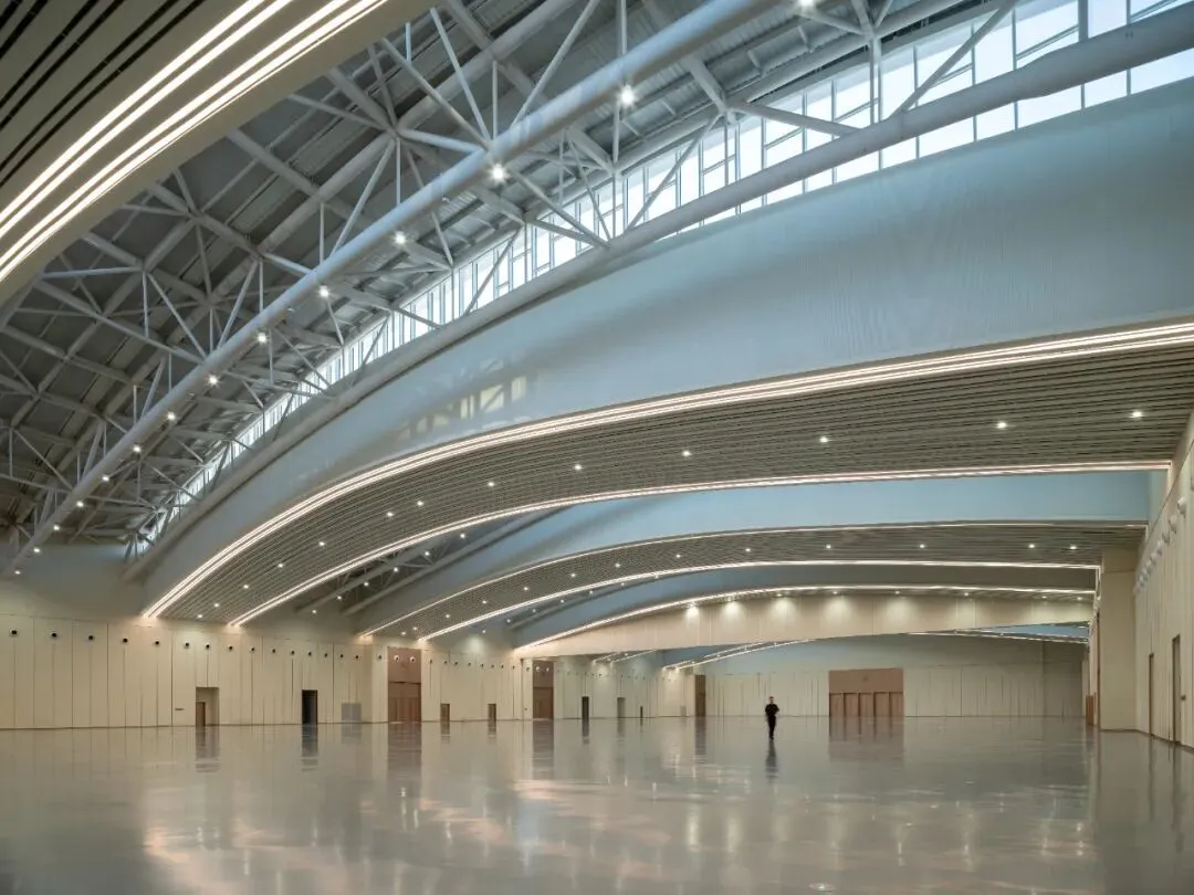 沿这条南北轴线两侧分别布置10000平米主展厅和5000平米多功能会展厅。这两个展厅为大跨度桁架的无柱空间。整体钢结构桁架沿屋面造型拱起,线条简洁而有力,在主展厅室内一览无余。高低错落的屋面结构形成侧窗,也兼顾了展厅平时日间采光的使用需求。