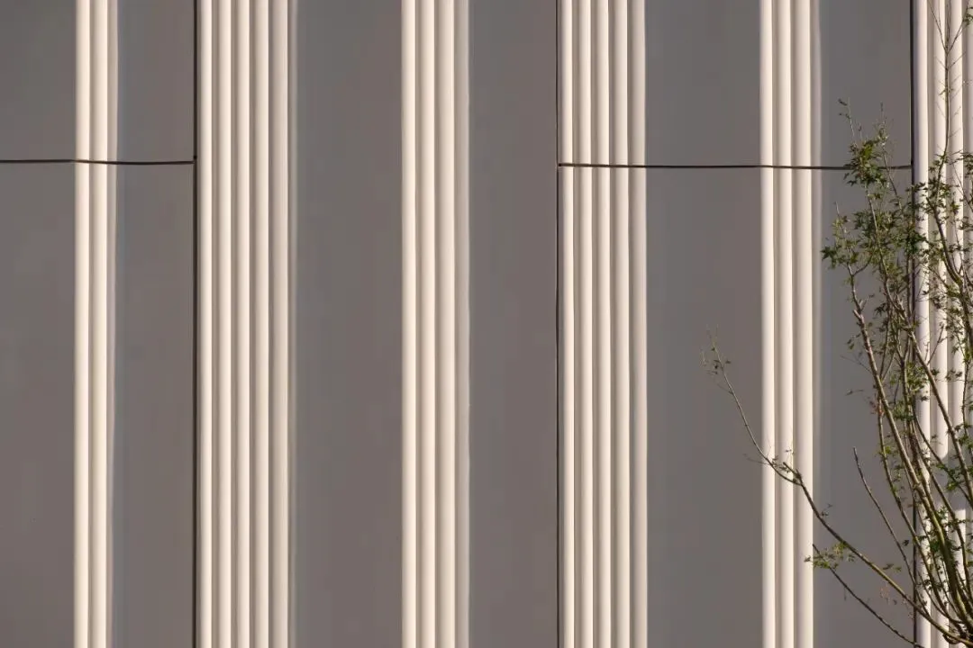 建筑的细部利用铝板与HUPC等材料创造出丰富多变的光影变化,也如同竹片凹曲的肌理造型。