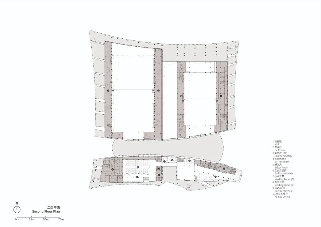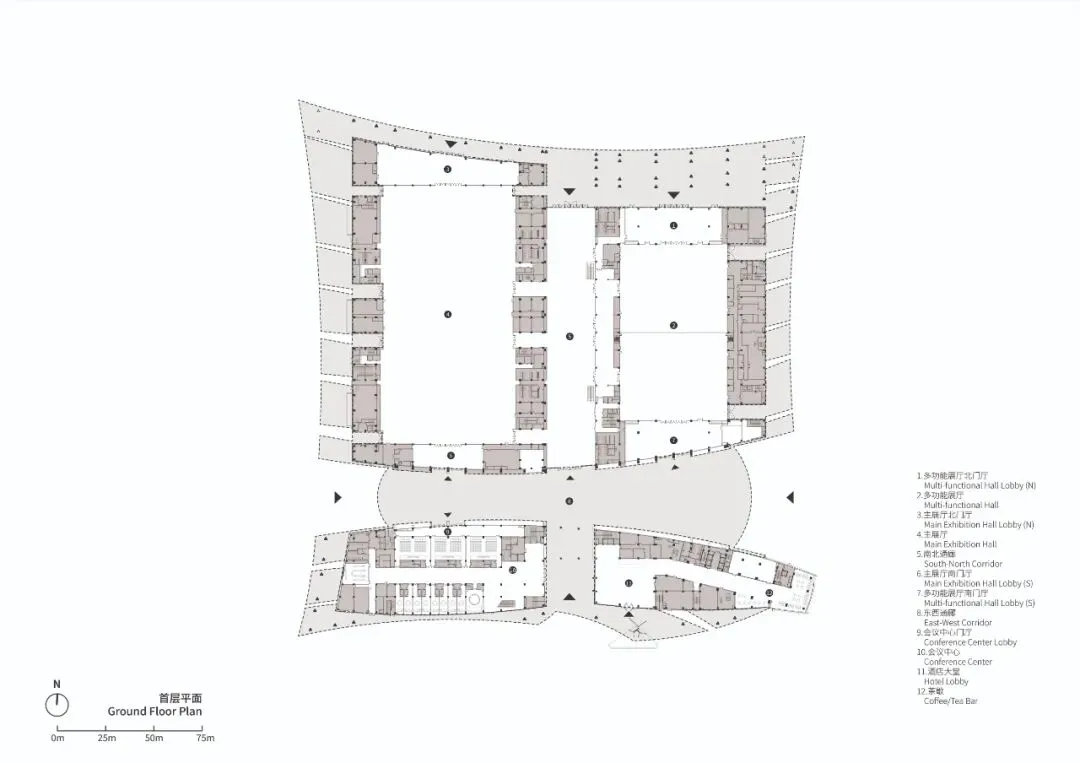 建筑整体采用十字形空间组织功能:重要公共空间位于十字形内侧,外围布置货运后勤等辅助功能。