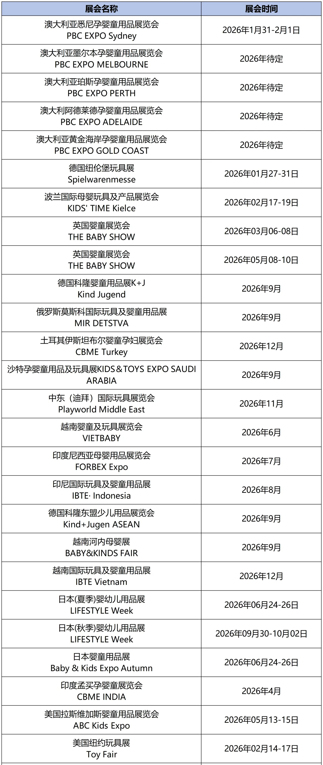2026年全球婴童玩具展会计划表