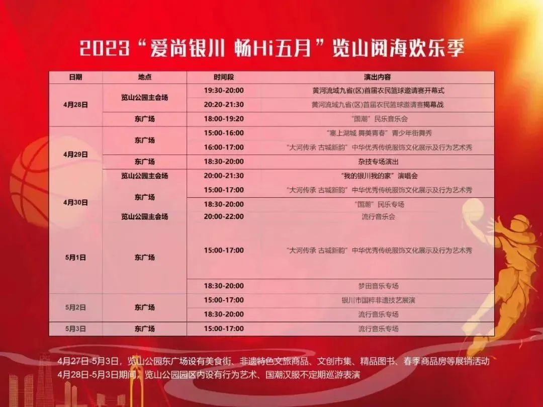 为做好旅游接待工作,各景区提前策划、统筹部署,切实保障游客快乐出行。军博园景区开展“真人cs大战集结营”、劳动节相关知识有奖问答,学习五一知识,丰富文化生活;西夏陵景区开展“穿梭千年时空”汉服游园会,通过一场穿越西夏的旅行,感受贺兰山的雄浑、西夏陵的壮观;贺兰山岩画景区依托景区浓厚的文化元素背景打造“春游会”,共赴浪漫的花海盛会;黄河外滩景区“国潮文化体验节”,沉醉在传统文化之旅中,感受传统文化魅力;鸣翠湖景区“亲子嘉年华”“趣味游园会”“户外烧烤季”活动让人们感受生活,享受当下。同时览山公园黄河流域九省(区)首届农民篮球邀请赛盛大开幕,“塞上湖城 诗画银川”消费大集人潮涌动;会展分公司积极响应自治区“消费需求促进年”以及银川市委、市商务局、市政府消费促进工作安排部署,举办“宁夏国际车展”。