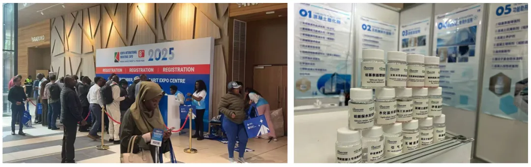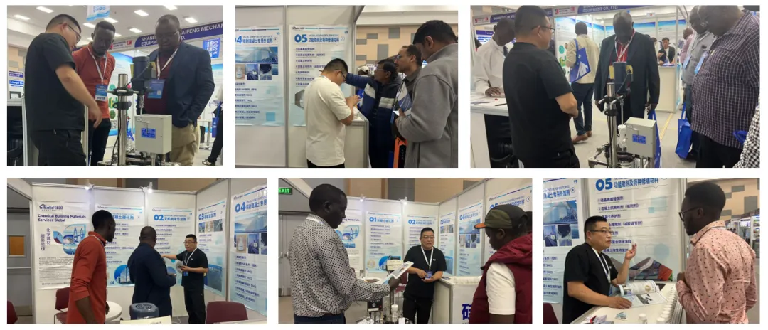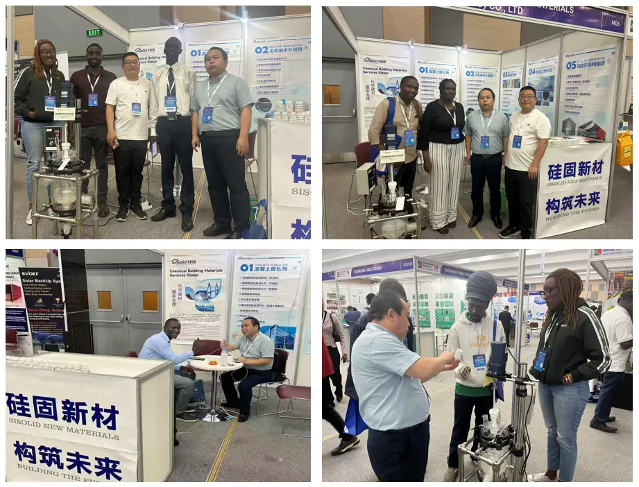 硅固科技展出了自主研发的五大核心产品:无机纳米外加剂、混凝土超塑化剂、喷射混凝土专用外加剂、砂浆添加剂、功能助剂及特种修缮材料。其中,无机纳米硅系列添加剂可提升建筑结构寿命30年以上,有效应对非洲高温高湿环境对建材的侵蚀。