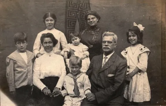 盈亨利一家人在1912年左右的合影。盈亨利(前排右二)、盈路德(后排右一)、伊莎贝尔(前排右一)