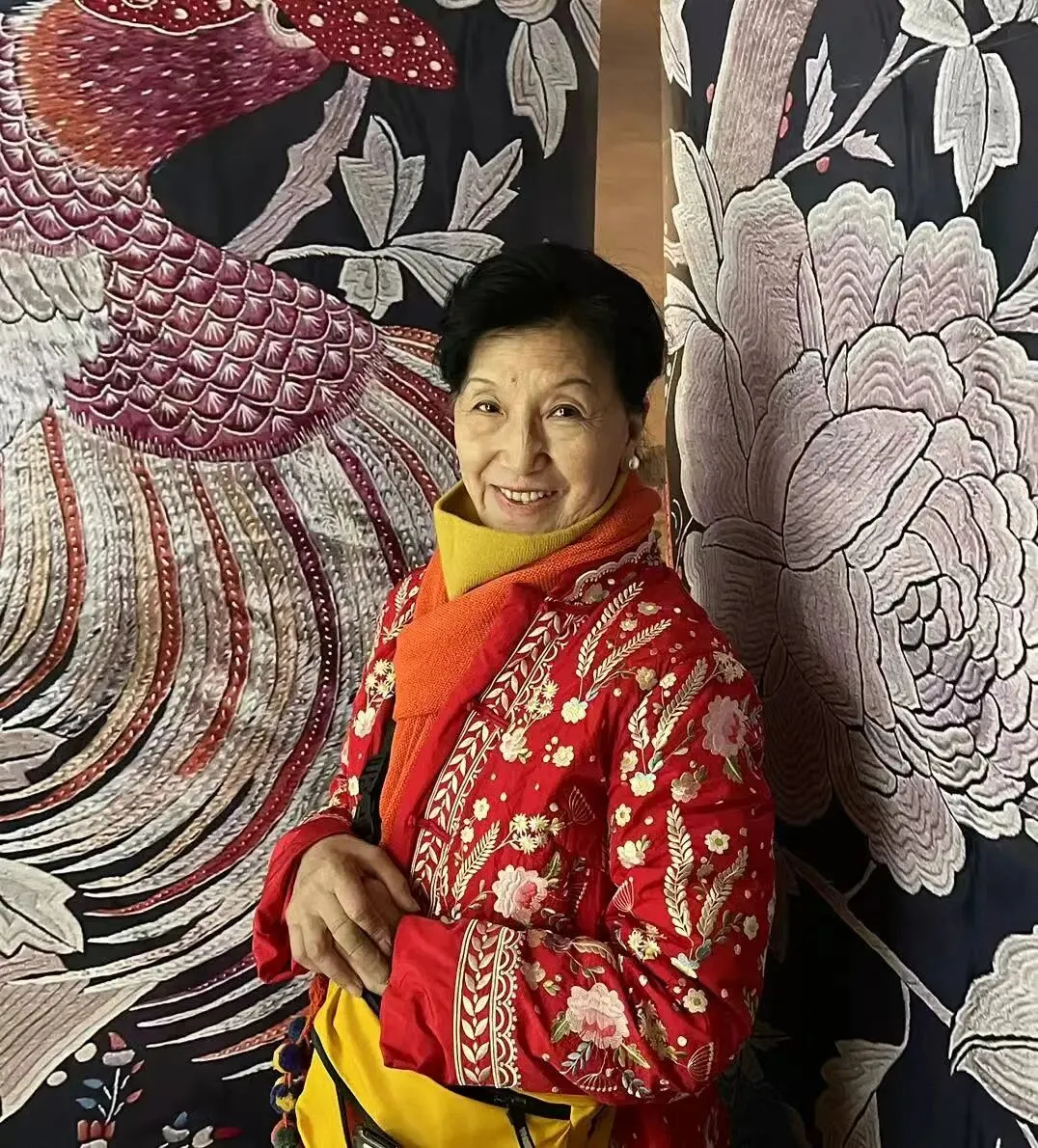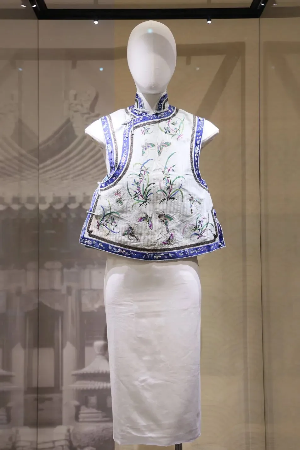 余翠雁(Sally Yu Leung):我看婉容的照片,可文静的一个女孩儿。所以我挑了这一件坎肩,它是天湖水的颜色,配上兰花、蝴蝶,给人非常优雅的感觉,看了那件衣服后会感觉一整个人的心安定下来,而婉容给我的第一印象就是这么一个人。