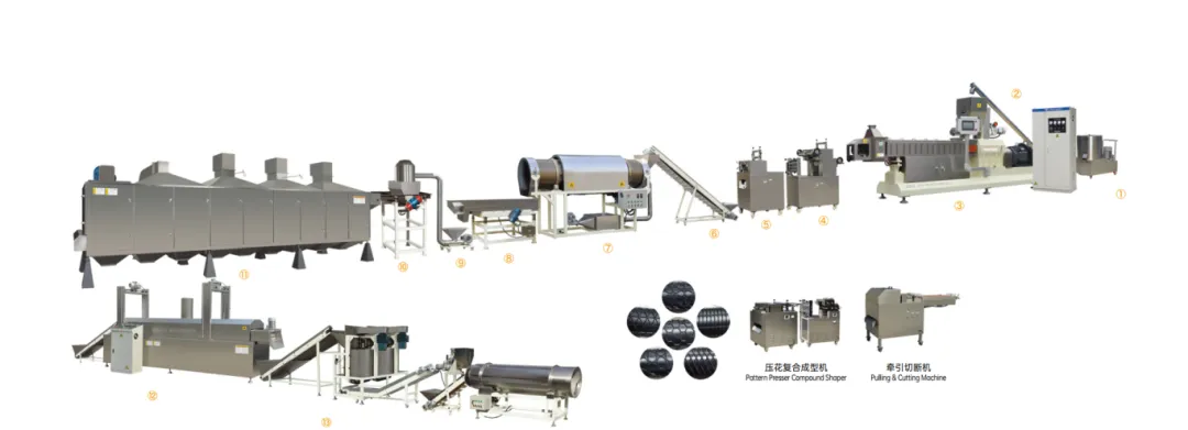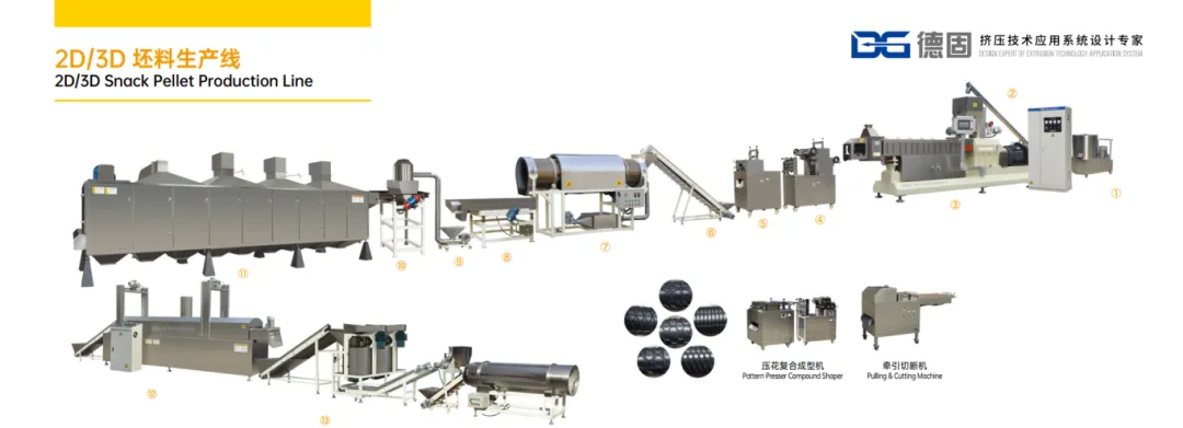 【1】拌粉机【2】螺旋提料机【3】DG75-II主机【4】3D压花机【5】3D复合成型机【6】大提升机【7】3D分离机【8】3D筛选机【9】风送机【10】冷却摊料机【11】五层穿透式烘箱【12】4米连续油炸机【13】双甩油线【14】调味线