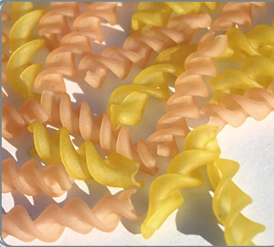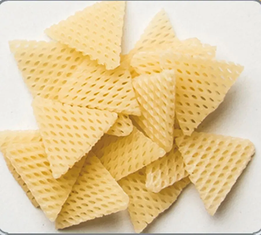 该生产线以面粉、玉米粉、玉米淀粉、木薯淀粉、马铃薯淀粉等为原料,即可经双螺杆挤压机直接挤出成型、切断,生产螺旋、方/圆管、洋葱圈、波浪片等2D坯料;也可配套压花复合生产妙脆角、网络脆、鸭蛋圆等3D坯料。坯料经烘干、油炸、调味,即可制成口感细腻酥脆、表面光滑、造型逼真的二次膨化食品;我们的螺杆组合技术及对生产过程的精准控制,可使您的原料选择更广、产品品质更优、品种更多样。