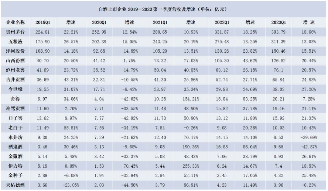 受客观环境影响,白酒行业在2020年、2021年、2022年三年中遭遇较大的波动,既有2020年的一季度的暴跌,也有2021年与和2022年一季度的爆发式回归。但从数据来看,2023年第一季度相比疫情前的2019年一季度,都已实现了相当可观的增长。