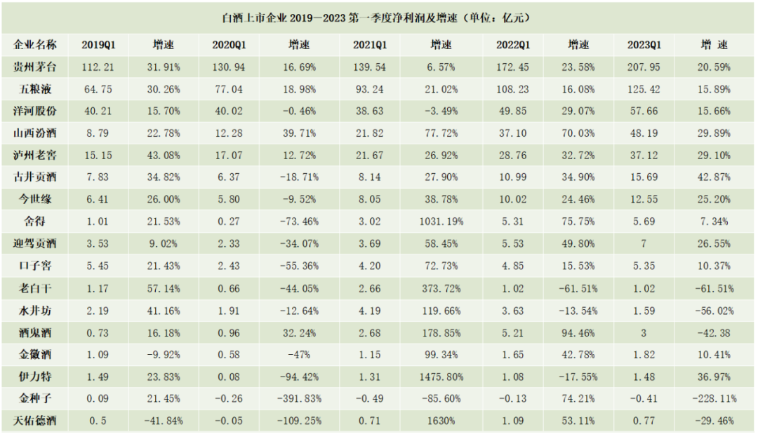 2023年第一季度,可比上市公司中12家实现利润增长,其中古井贡酒更是实现42.87%的高速增长。