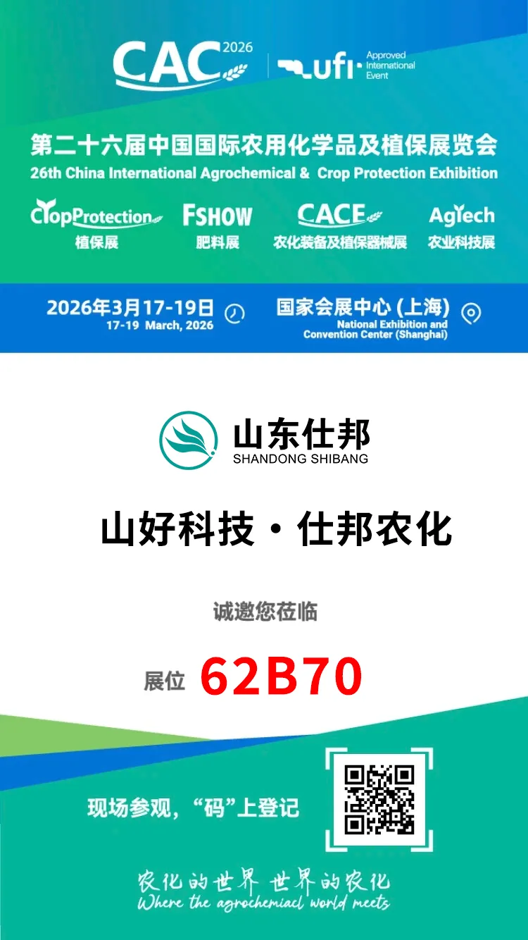 第二十六届中国国际农用化学品及植保展览会(CAC2026)将于2026年3月17日—19日在国家会展中心(上海)举办。 山好科技·仕邦诚挚邀请您莅临展位 62B70,深化交流合作,携手推动农化行业高质量发展,期待与您相聚!