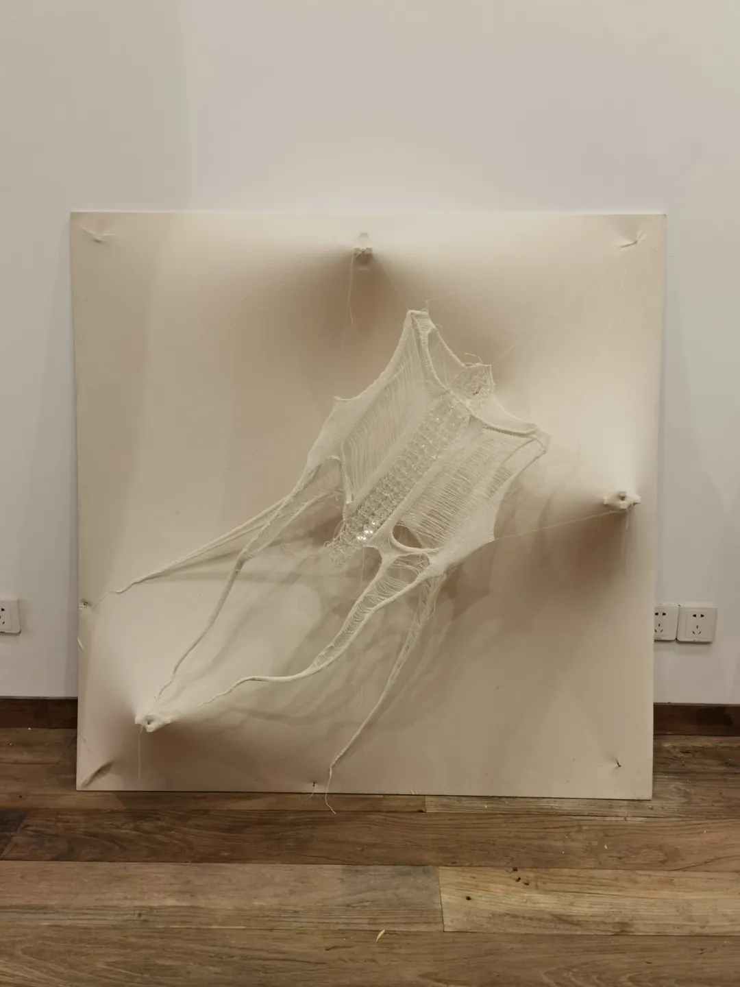 一块板,一张布,用木棒做的结构撑起绷在板上的弹力布,形成若隐若现的形态。