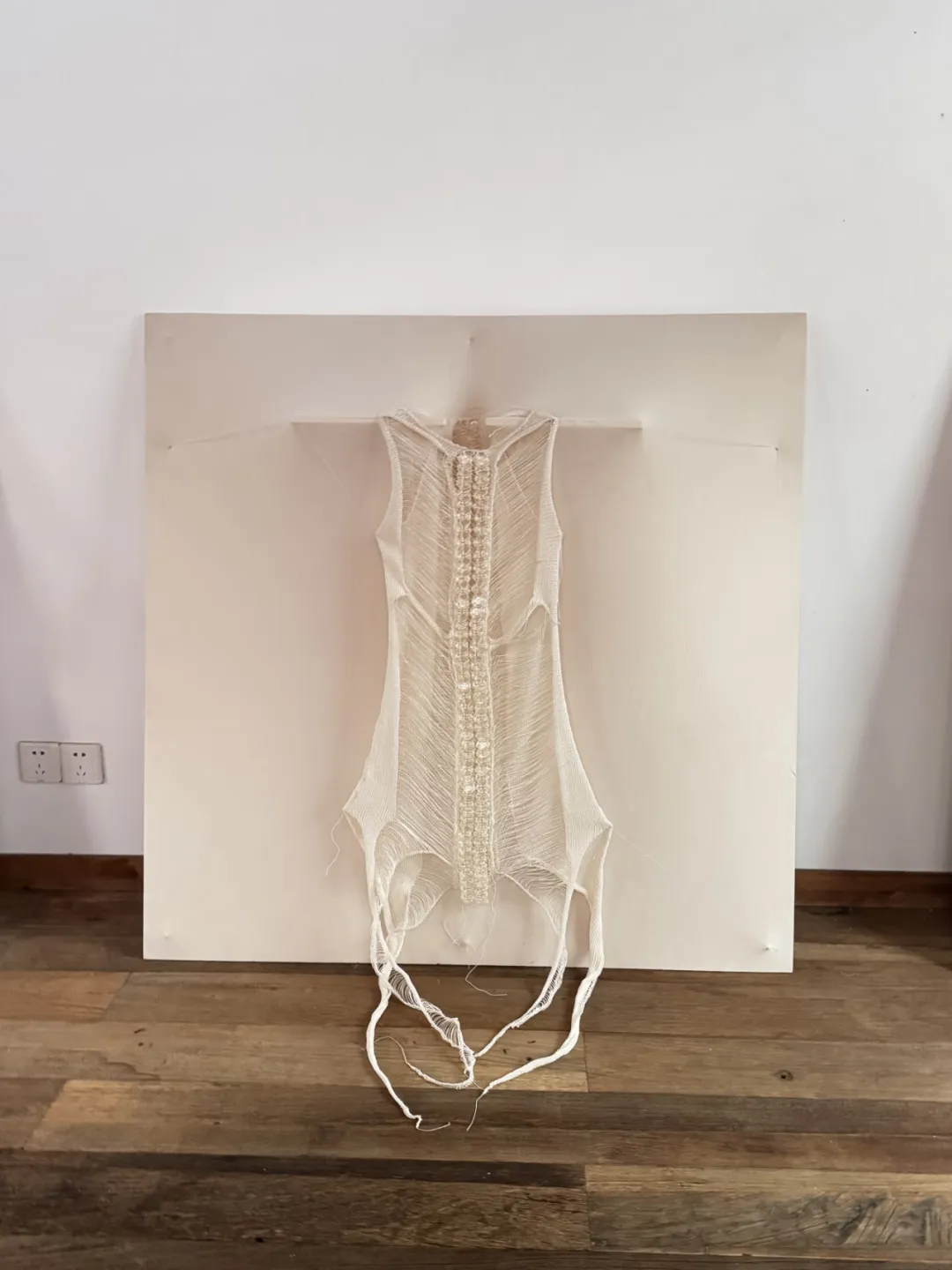 一开始裙子在装置上做的比较满,没有考虑空间留白,慢慢减少拉着裙子边缘的线,最后干脆就让裙子自然下落。