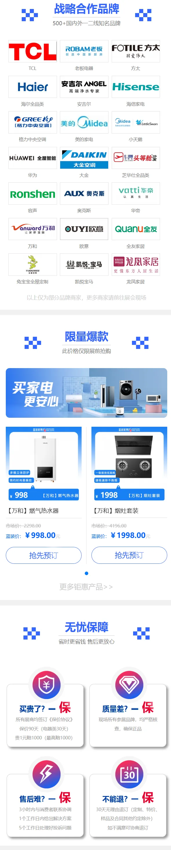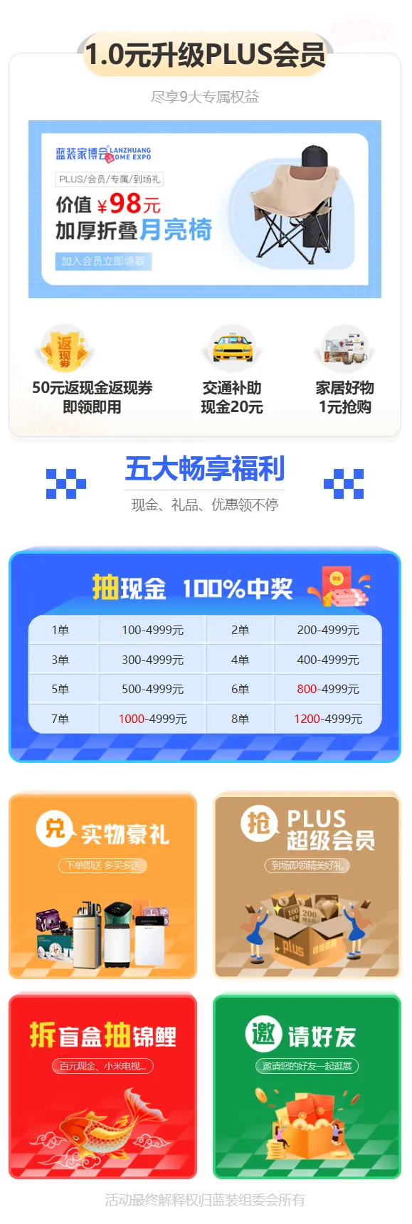 现金抽奖活动:现场下订(订金满1000元、实付满3000元)并与商家签订蓝装家博会专用订金单,即可参与现金抽奖,奖项为100-4999元不等,中奖率100%。