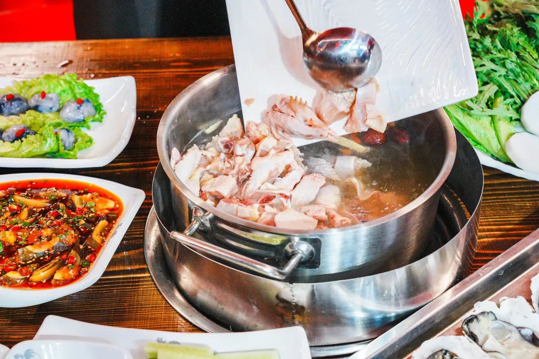 药膳汤底沸腾后,就可以把整只鸡放下去了,不得不夸一下,这里的鸡斩件很走心,连鸡肾都切好给你,一整只鸡拿起来还是很重手的。