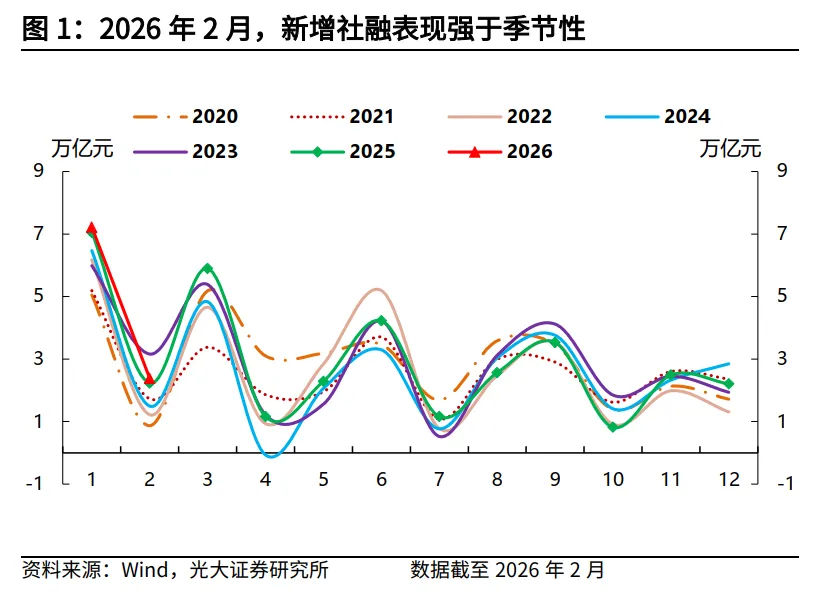 (1)2月份新增社融23792亿元,同比多增1461亿元,表现高于市场预期。从季节性表现来看,2月份社融增量高于过去六年(2020-2025年,下同)17843亿元的同期均值。2月末,社融存量同比增速为8.2%,与上月持平。