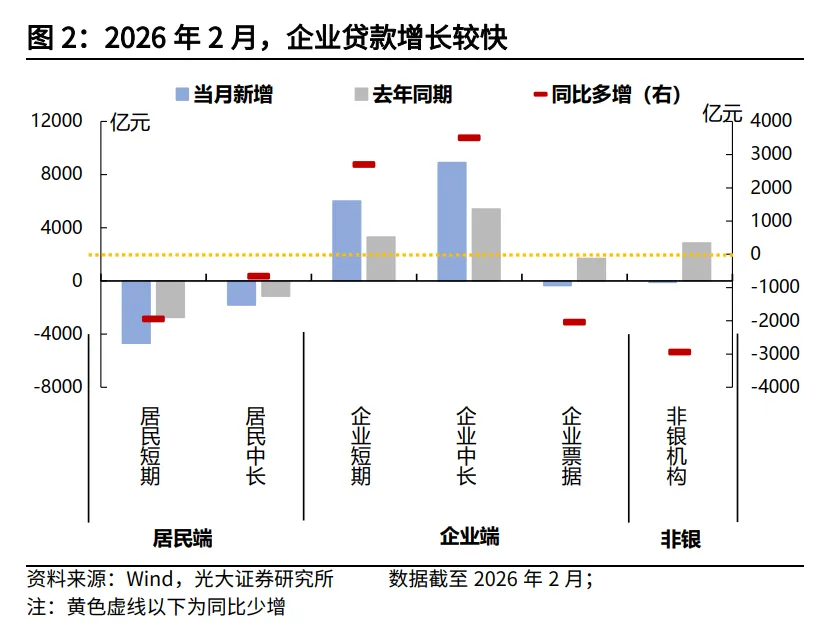 (1)企业贷款需求边际好转。企业贷款方面,2月份企业贷款同比大幅多增,是支撑2月份金融指标的最主要贡献。但若考虑春节错位的扰动,合并1-2月来看,企业中长期贷款同比多增700亿元,增长的幅度有限。