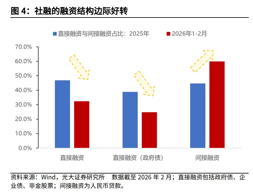 数据显示,2025年全年,政府债融资、直接融资(政府债+企业债+非金股票)、人民币贷款分别占社融增量的38.9%、46.9%、44.7%;而2026年1-2月,三者分别占社融增量的24.8%、32.4%、59.9%。表明2026年开年以来,更反映私人部门融资需求的间接融资对社融的贡献趋于上升。
