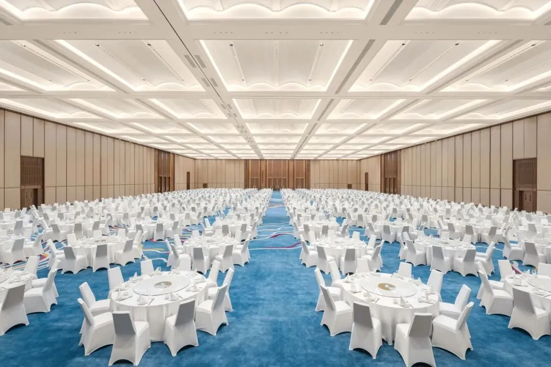宴会厅:面积4,500㎡,最多可容纳3,400人开会,可根据需求灵活分隔成8间380-830㎡的厅室;宴会厅采用无柱设计,确保每位参会者拥有绝佳视野,配置60个电动升降吊点,单点承重高达600kg,轻松驾驭大型LED屏、灯光矩阵及复杂舞美吊装需求;满足大型会议、晚宴庆典、文艺汇演等需求。
