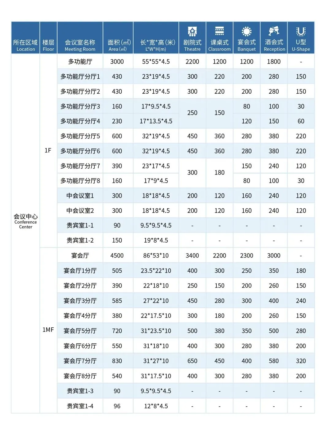 多功能厅:面积3,000㎡,最多可容纳2,200人开会,可根据需求灵活分割成8间160-600㎡的厅室;满足分会场、平行论坛、行业峰会等需求。