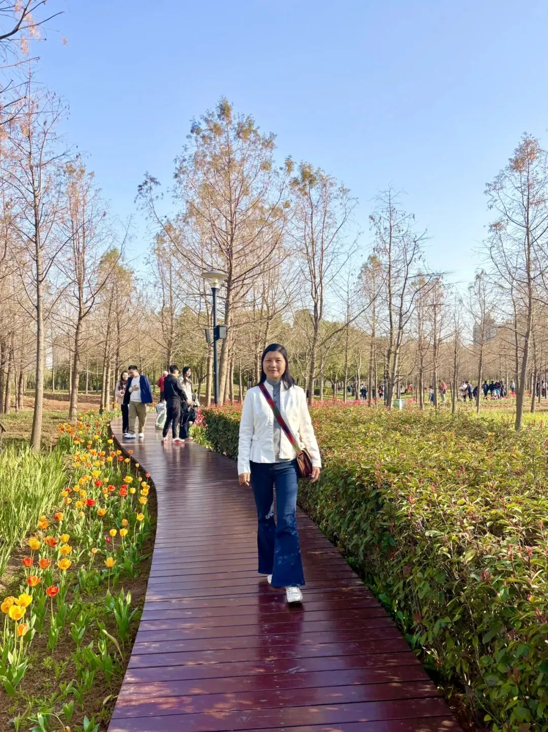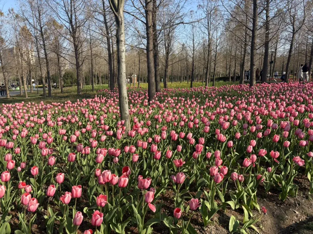 眼前是盛开的郁金香,粉粉的一大片,在水杉林间铺成了温柔的花毯。紫色花境与浦东图书馆的硬朗建筑相映成趣。我们走上木栈道,两侧是花海,还有树林,蜿蜒向前,漫步其间,仿佛在咏颂一首轻快的春之诗。
