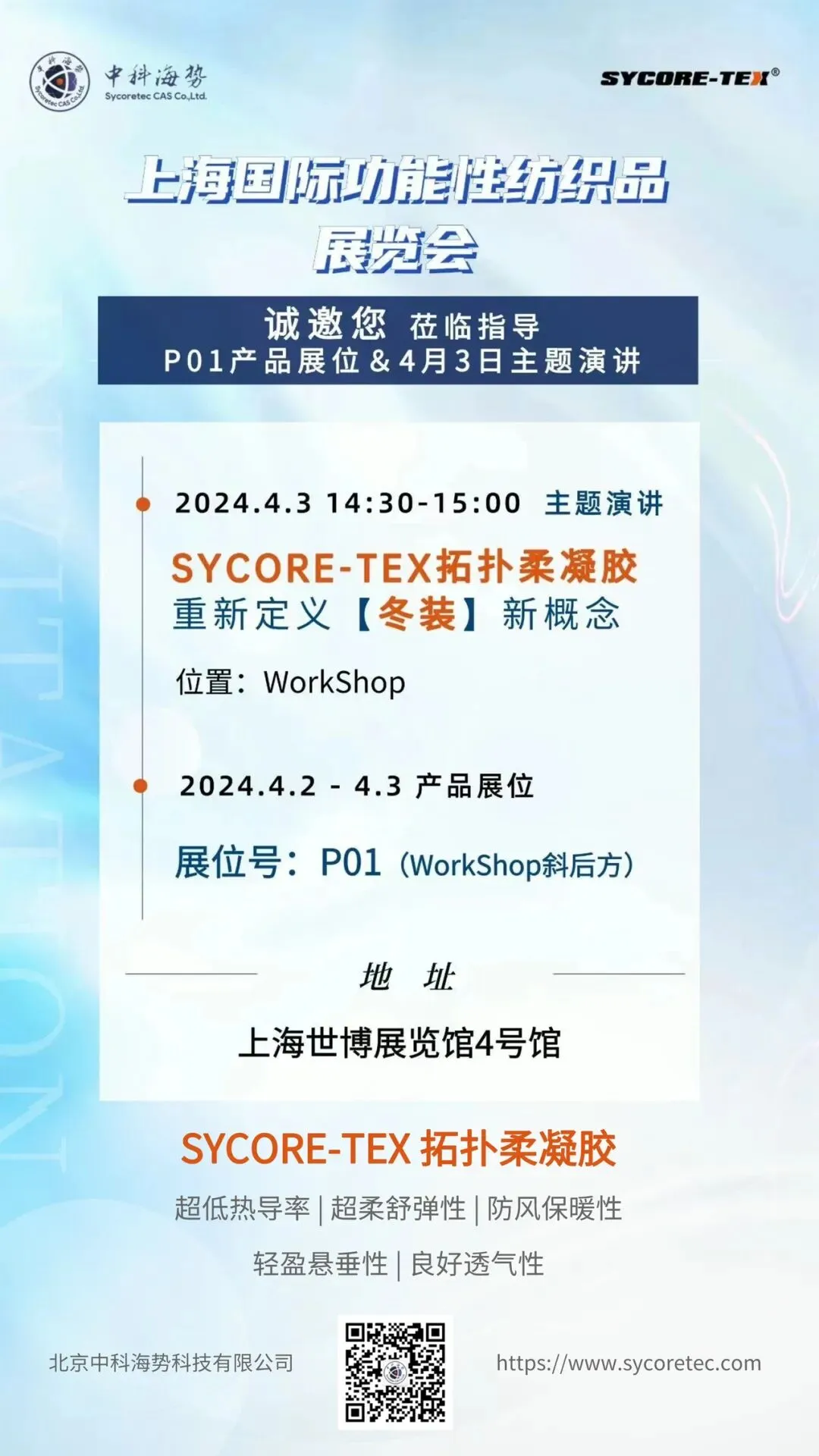 我司作为本届展会的参展商,将在现场展示“SYCORE - TEX”高科技热管理新材料的样卡及其制作的成衣,欢迎各位行业同仁前来试穿与交流合作。