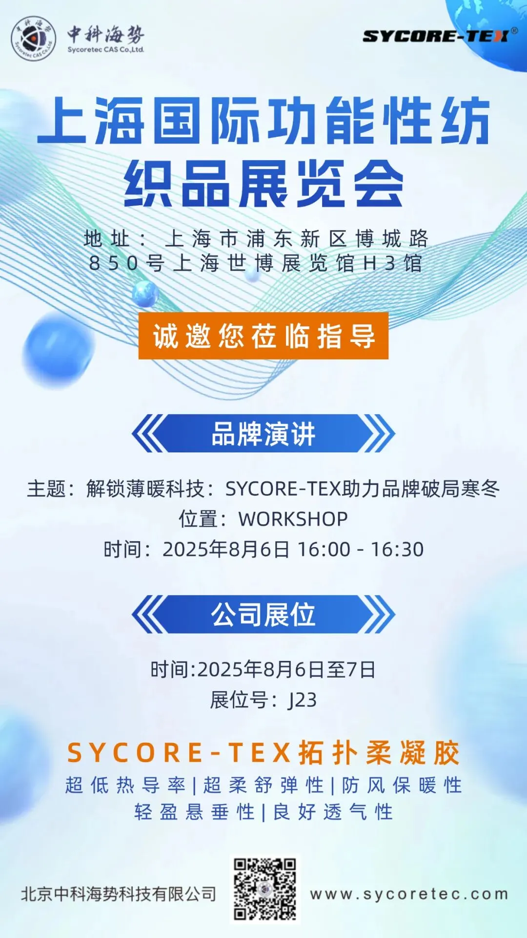 “ SYCORE - TEX 毸酷”高科技材料可应用于纺织服装、冷链物流、建筑保温以及特种领域等行业技术和产品需求。一经推出,即与多个国内外著名品牌公司达成战略合作,完全颠覆了厚重棉服、臃肿羽绒服占领冬季服装市场的现状,开启了"轻衣薄服,春装冬穿"的智能服装舒适体验新篇章!