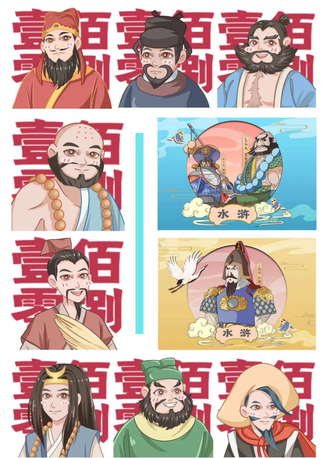本插画有13副,3个系列。第一个系列:两幅,以武松打虎和武大郎卖炊饼为主题创作。第二个系列:三幅,以水浒108将里面的人物进行创作,风格:漫画风。第三个系列:八幅,以水浒108将里面的人物进行创作,风格:萌版、Q版、可爱风。