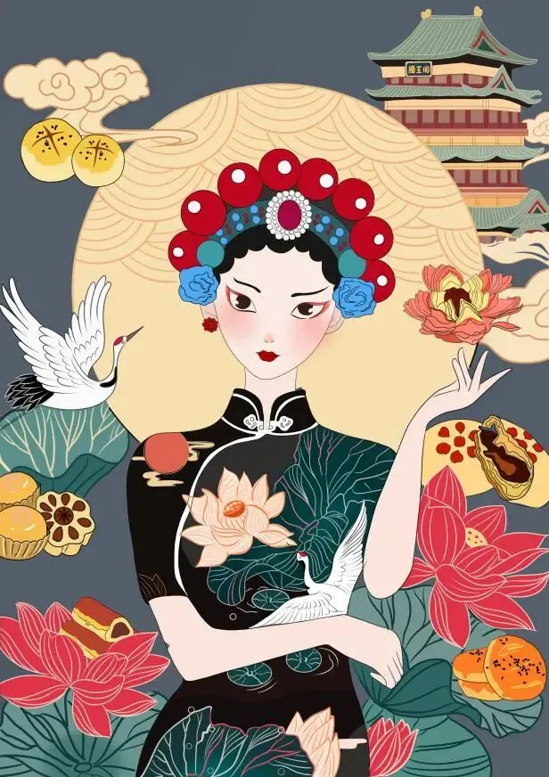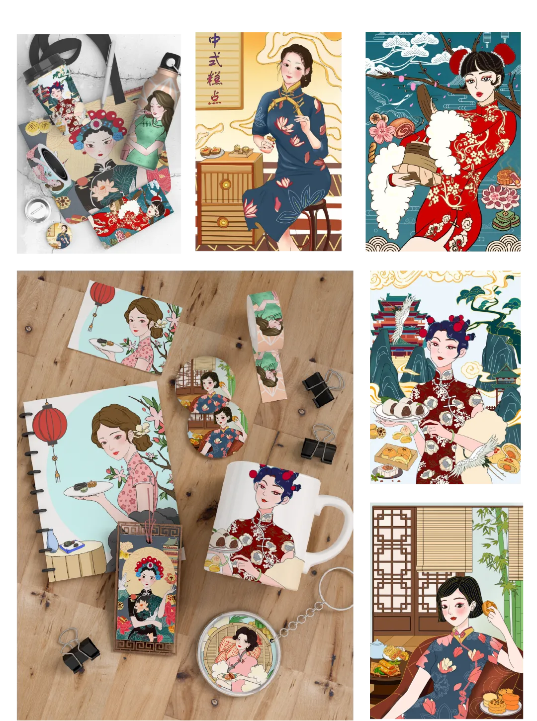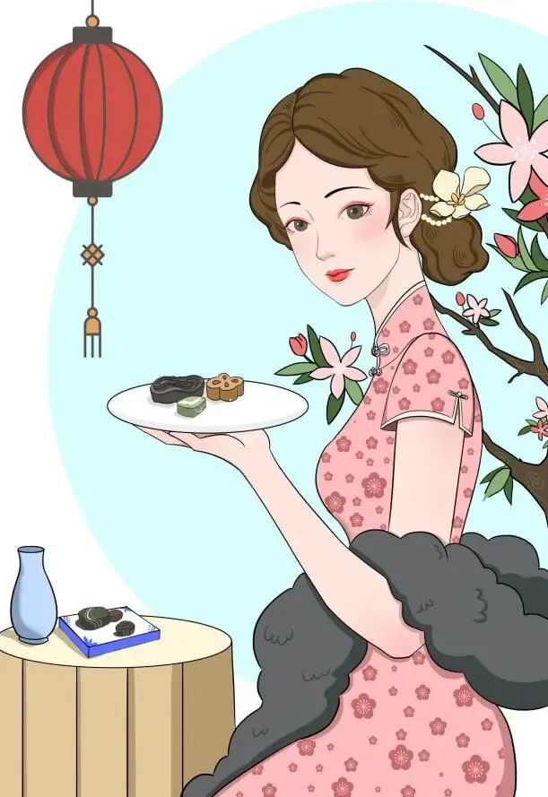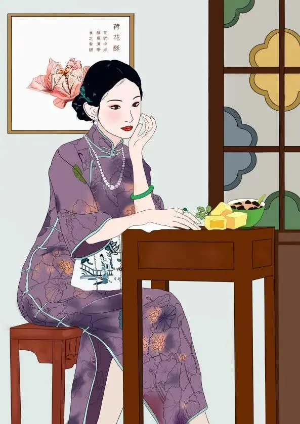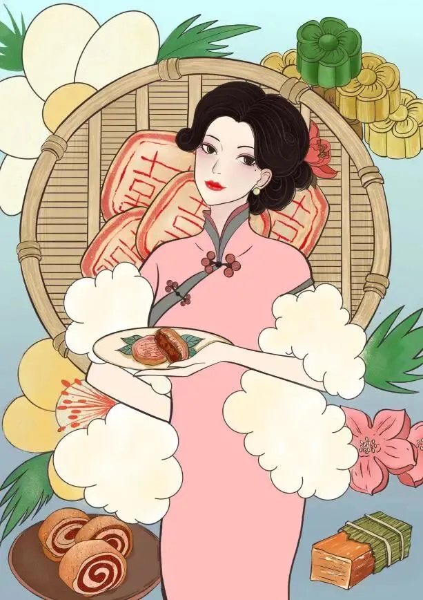 插画蕴含的中国旗袍文化结合中式糕点,带有中国特定元素的潮品,在满足人们物质需求与精神需求的同时,宣传传统文化,使广大消费群体对中式糕点形成新的认识,对中国优秀传统文化产生更深的了解。
