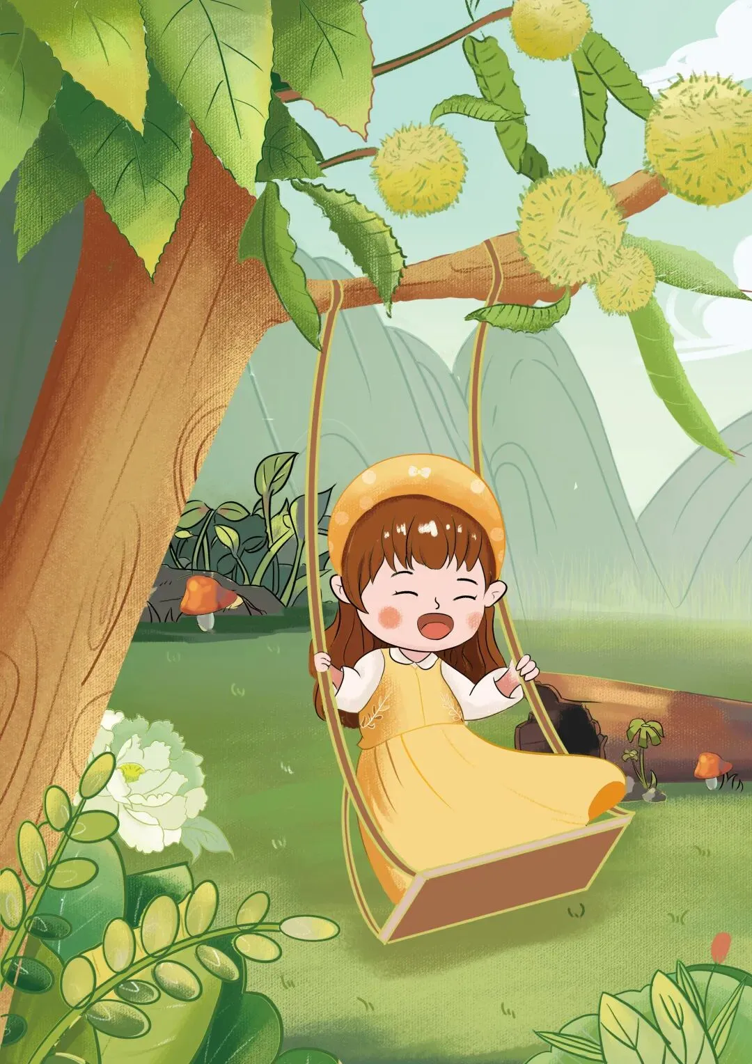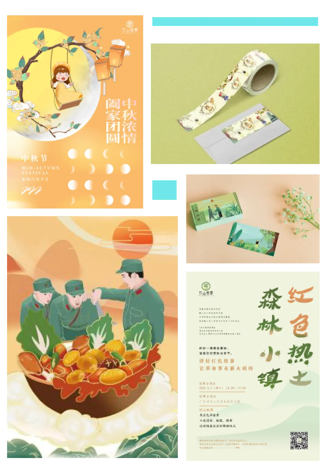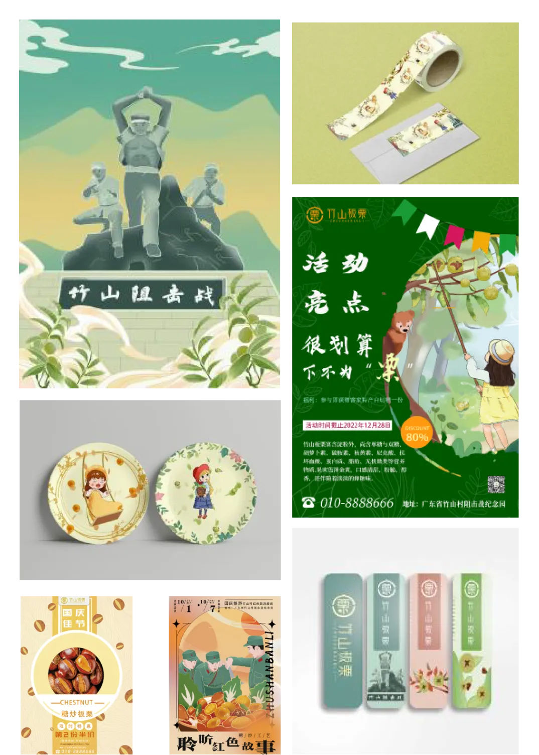 4.插画分三个系列绘制,三类主题分别是:竹山村笛击战的军人、小女孩和板栗树互动、板栗的包装方面插画设计。整体包装简洁大方,凸显食物与品牌调性。