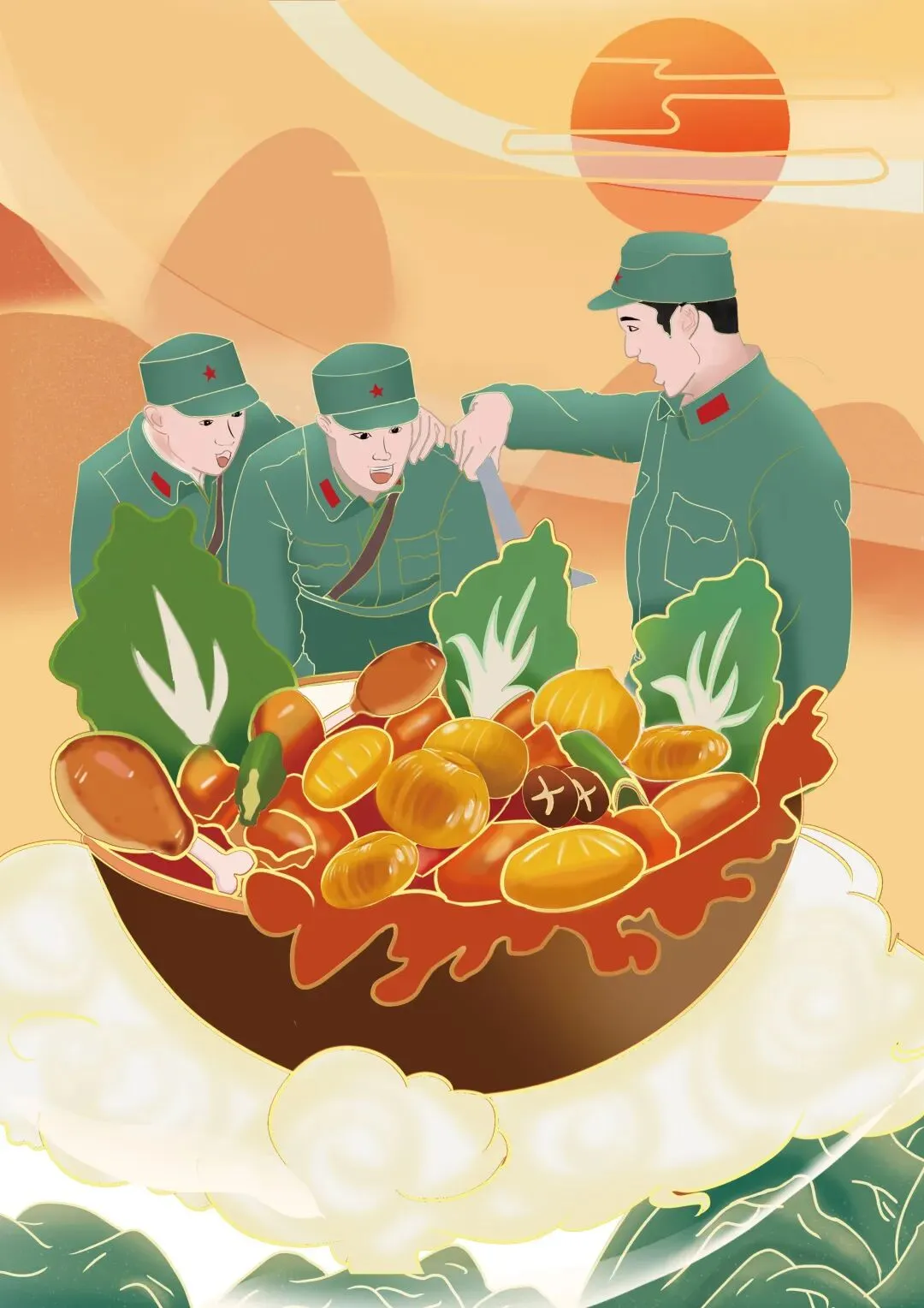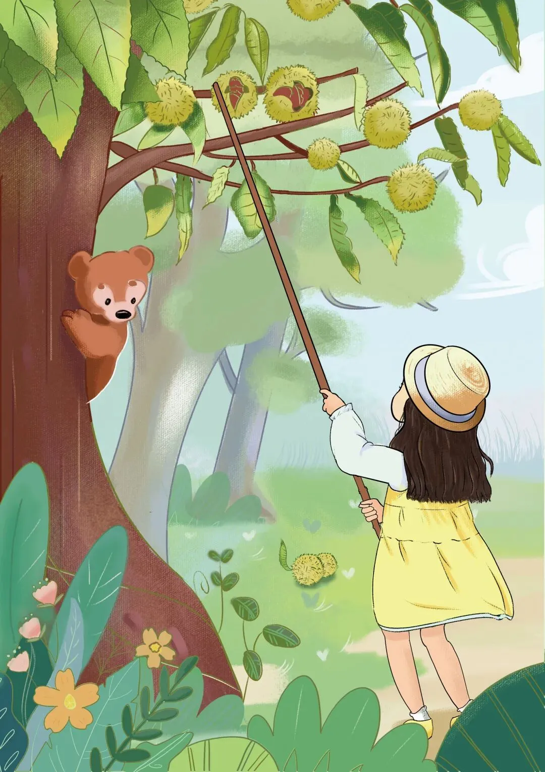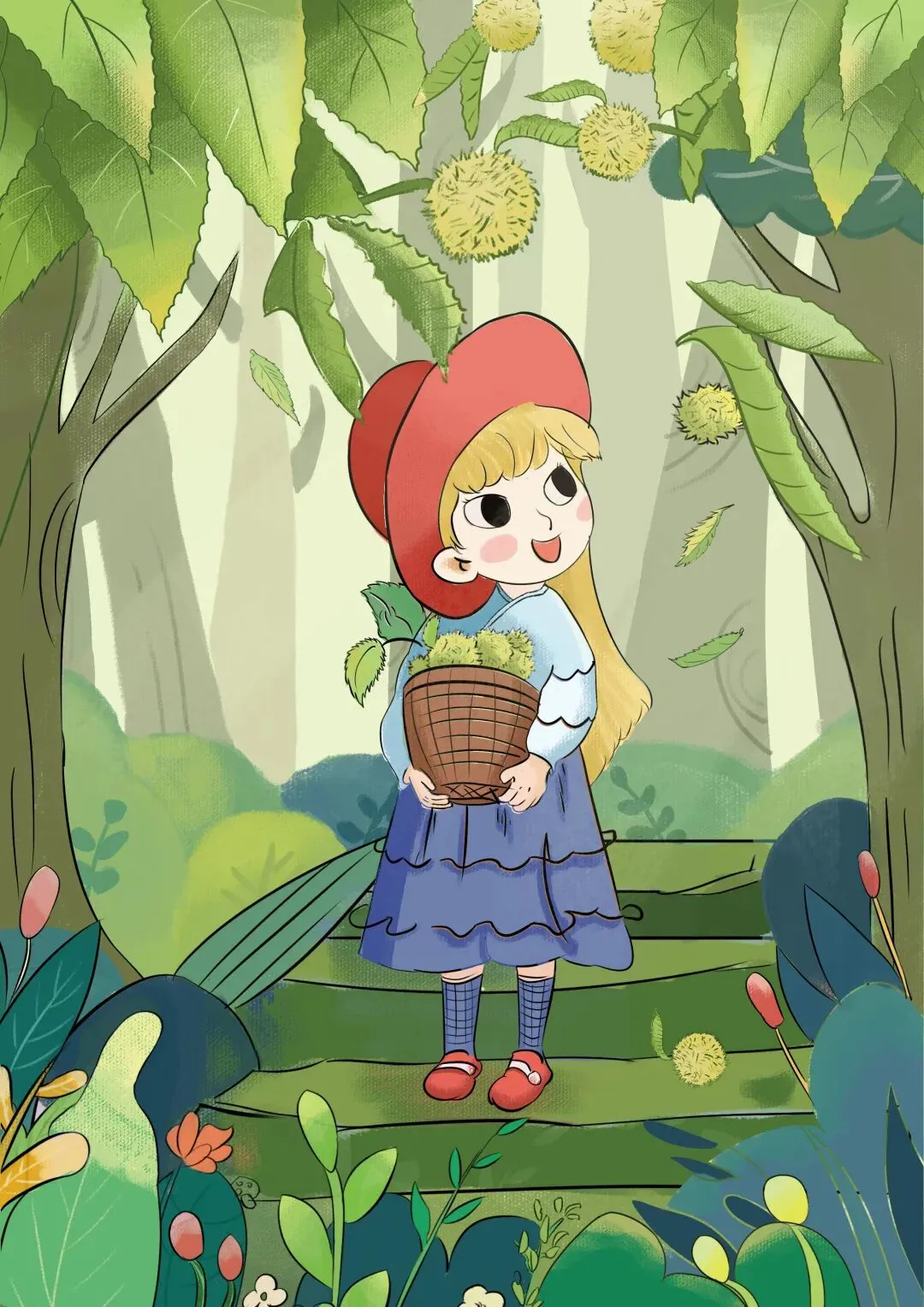 4.插画分三个系列绘制,三类主题分别是:竹山村笛击战的军人、小女孩和板栗树互动、板栗的包装方面插画设计。整体包装简洁大方,凸显食物与品牌调性。