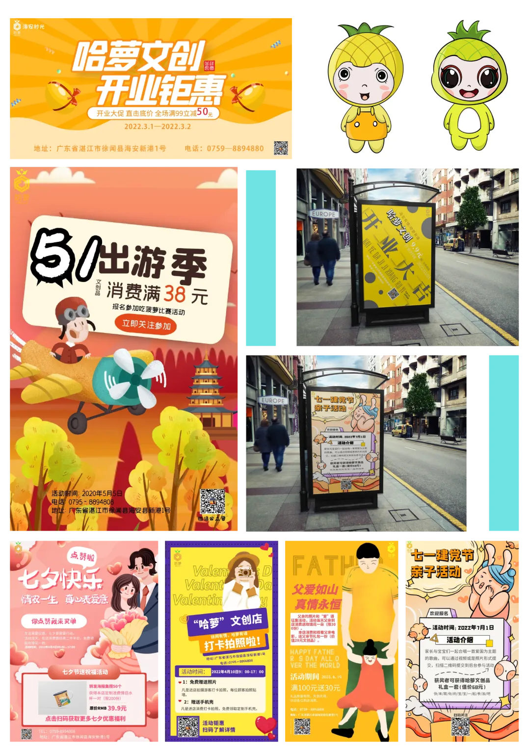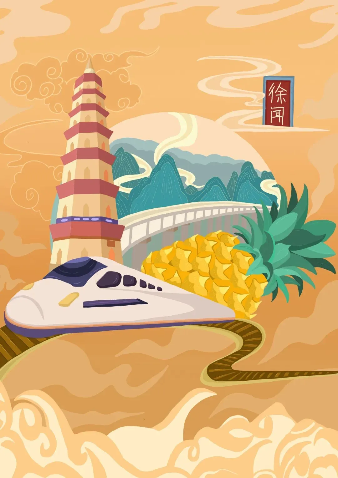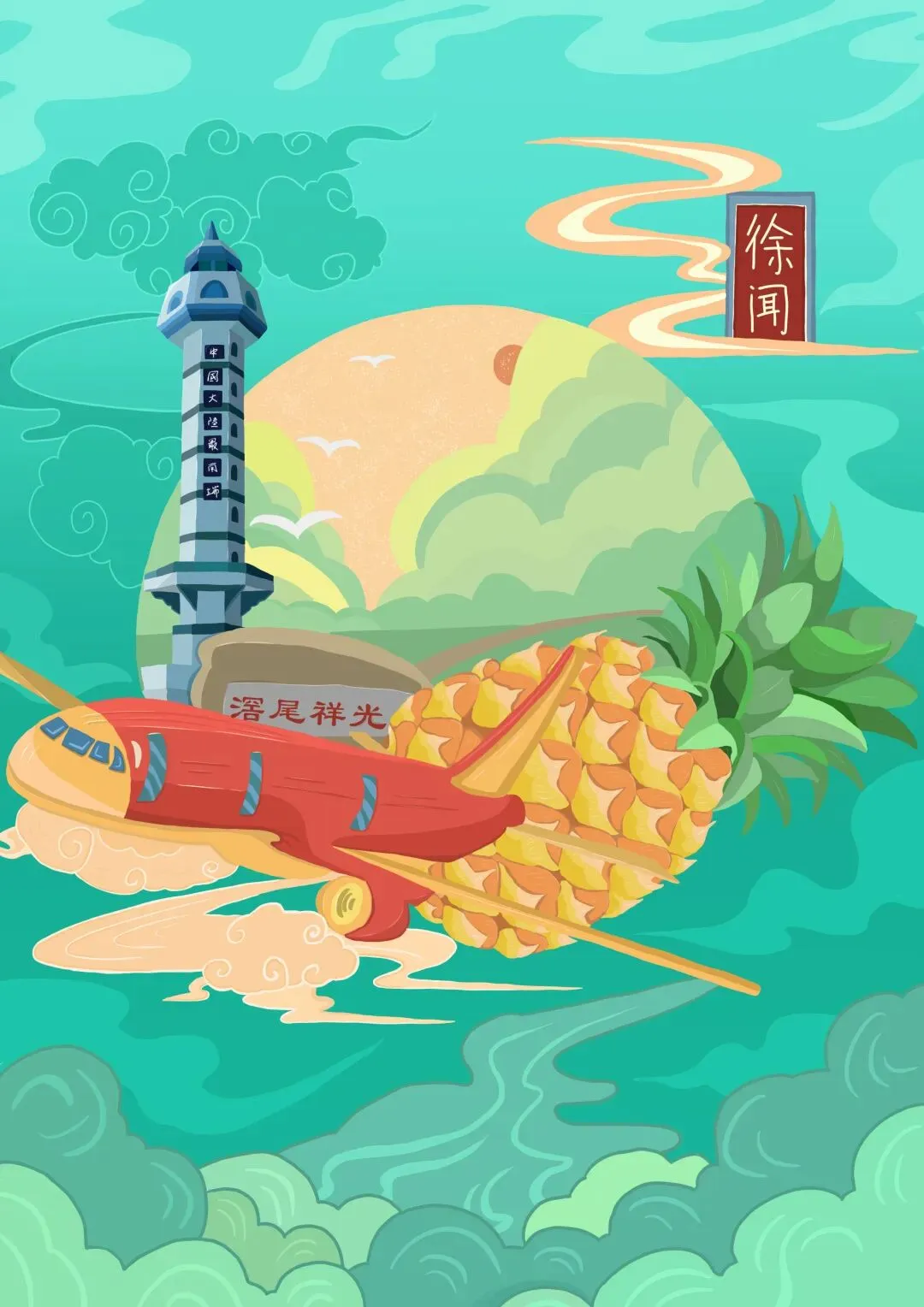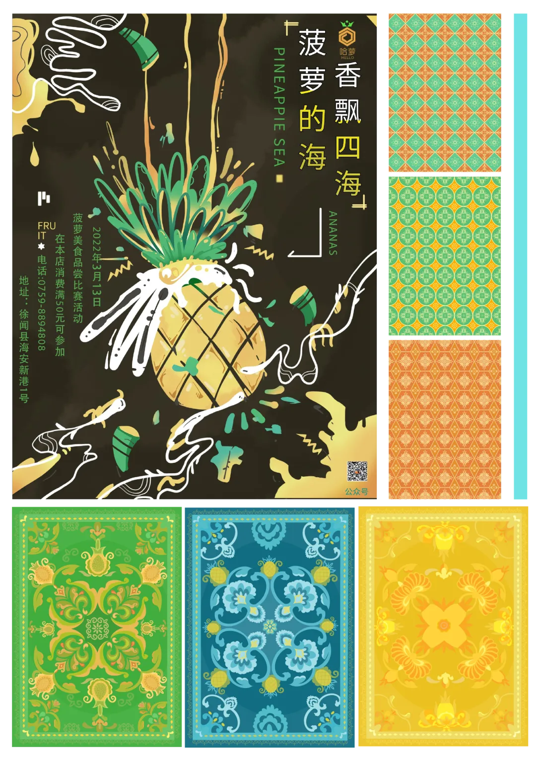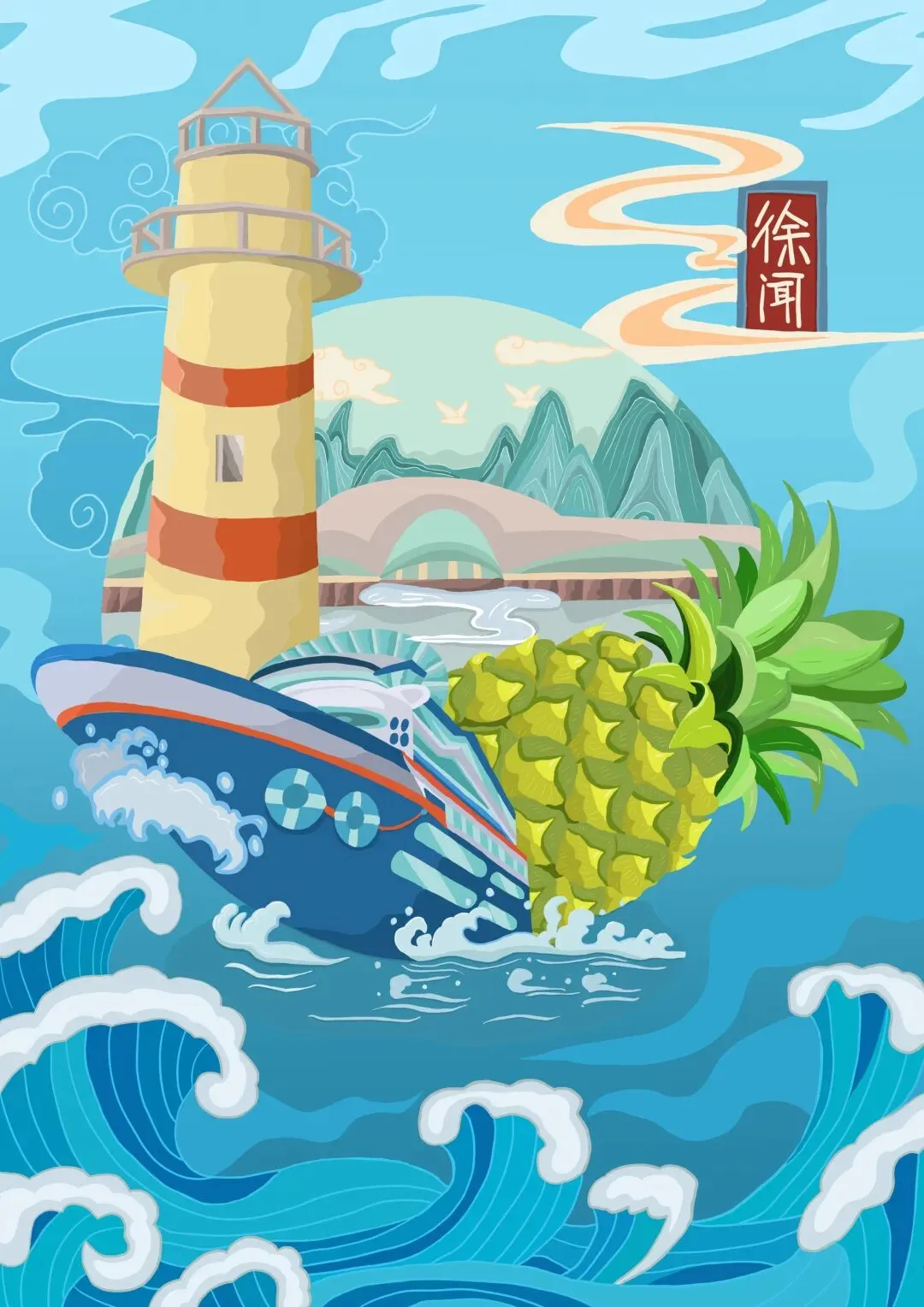 主要从徐闻海上丝绸之路和徐闻相关资料为参考,从徐闻“海上丝绸之路”场景表达现在徐闻历史悠久和发展,用菠萝和现代交通工具轮船、飞机、高铁构建出一系列插画。通过插画的视觉展现,赋予“哈萝”徐闻农产品主题文创品牌文化内涵,使得越来越多的人能够了徐闻农产品和历史文化。